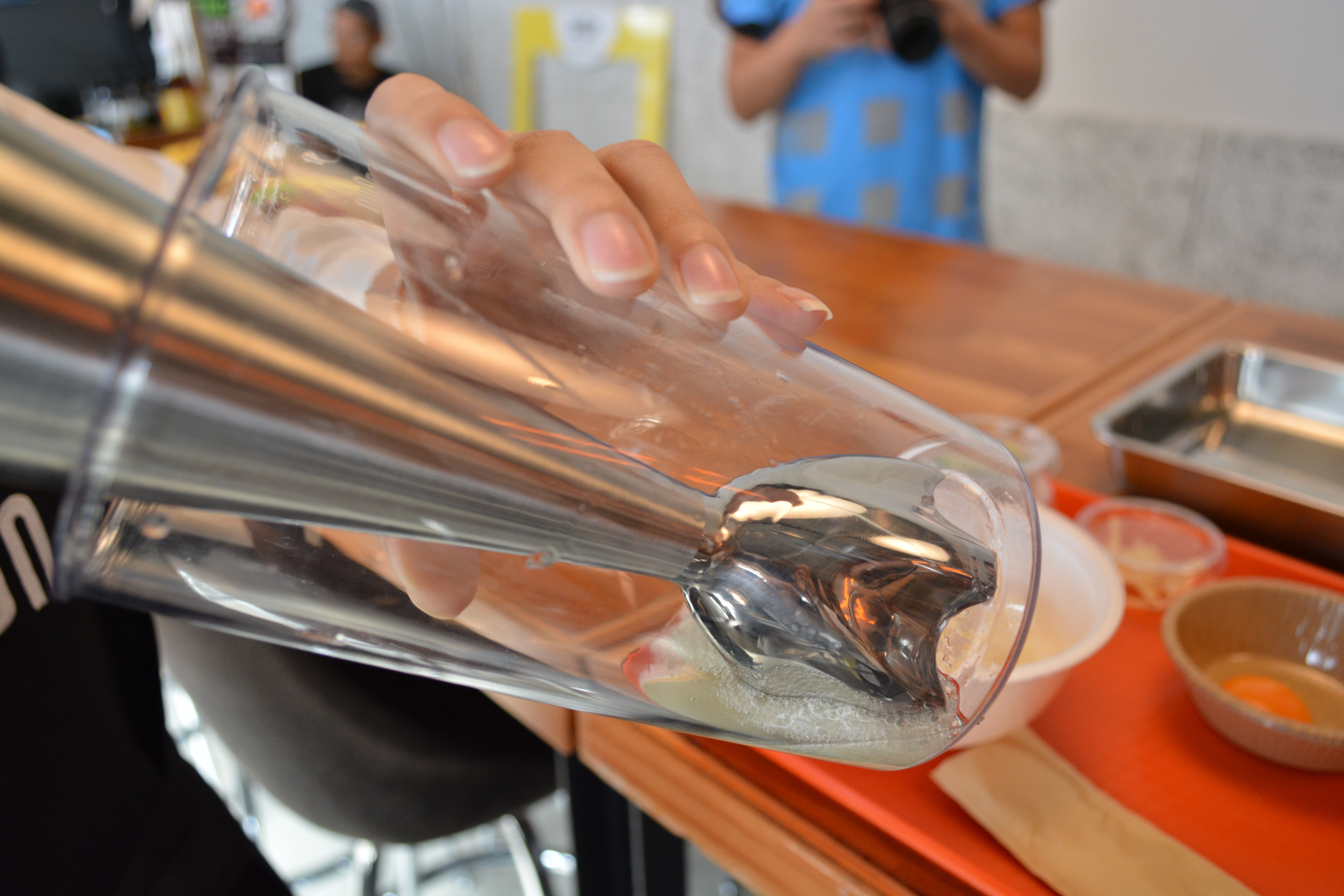 メインの作業は白身の泡立てです。といっても時間はわずか40〜50秒。専用カップにはすでに白身だけが入っているので、それを「ブラウン マルチクイック」で混ぜるだけ。と思いきや、混ぜ方にもしっかりとコツがありました!