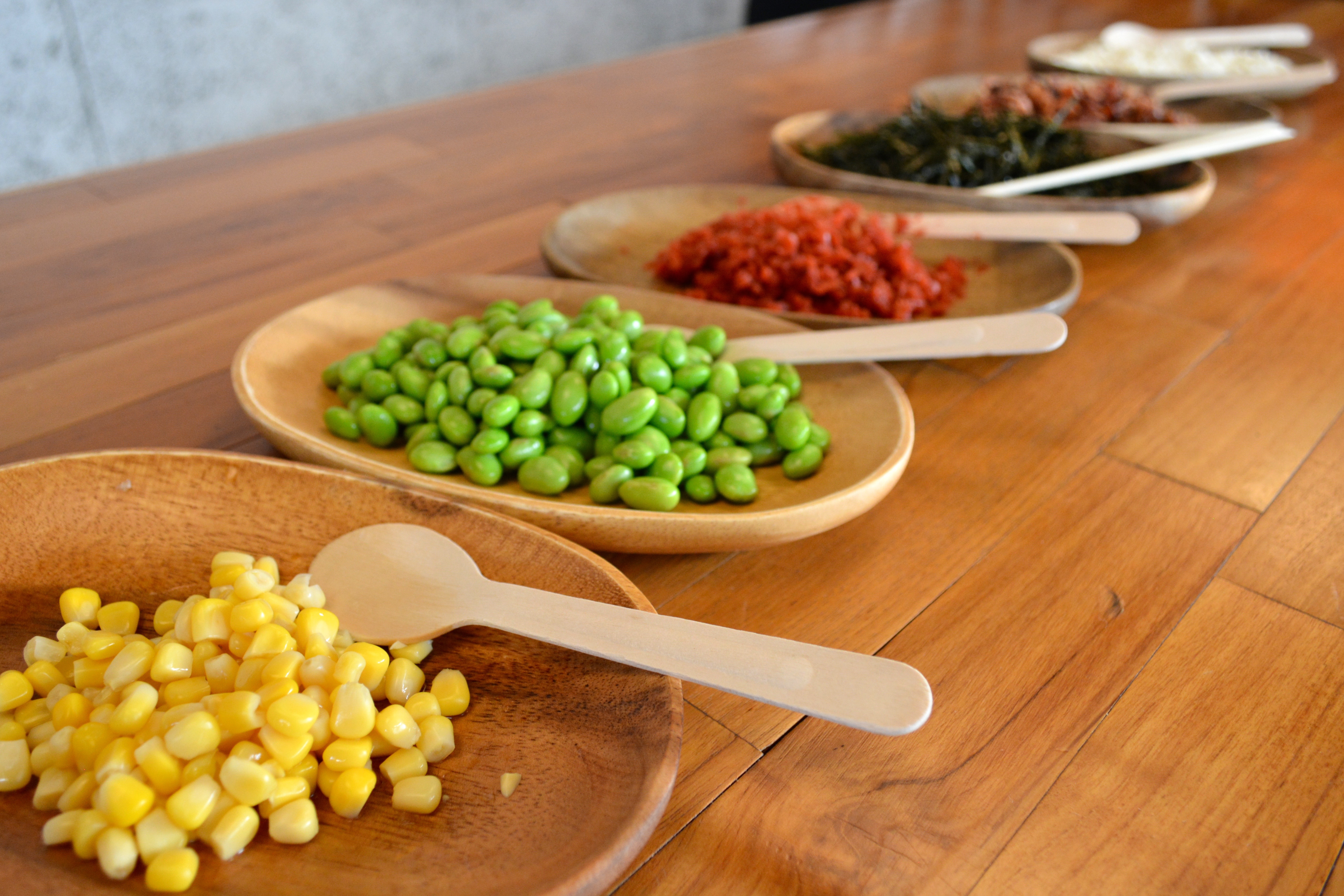 後乗せトッピングはコーン/枝豆/カリカリ梅/刻み海苔/焼きベーコン/粉チーズ/おかかの7種から選べます。