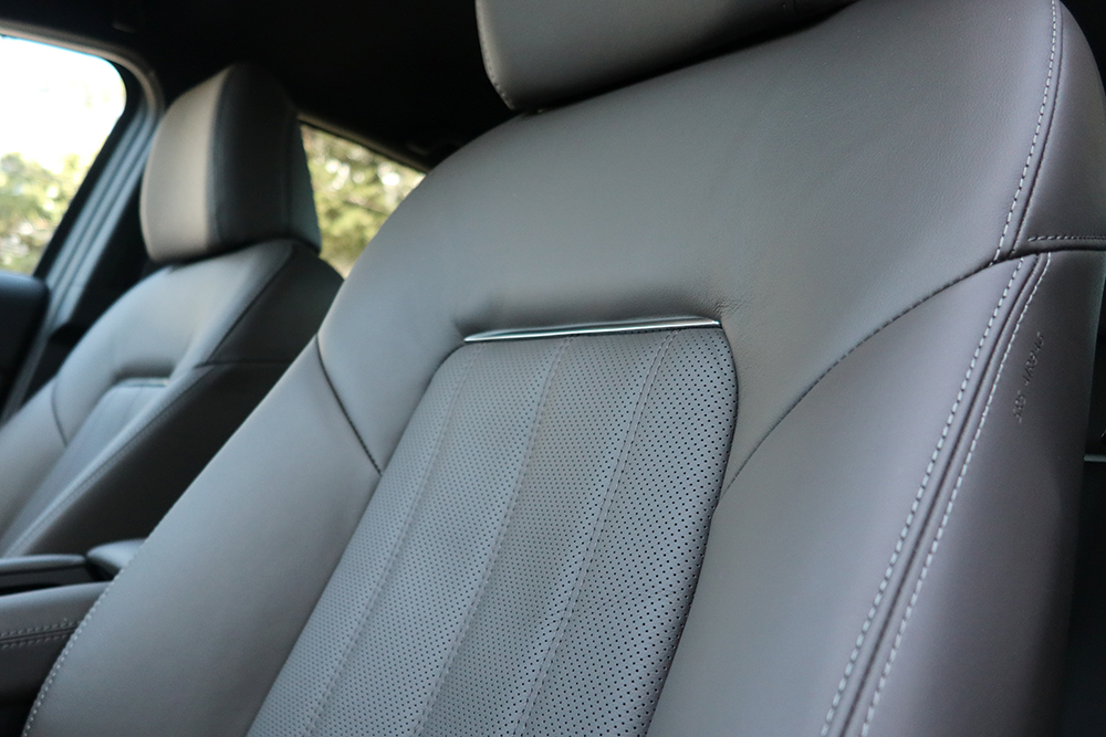 シートは、乗る人の骨盤を安定させ、背骨が自然なS字カーブを描くようドライビングポジションをより追求してきたほか、不快な振動を感じさせない構造を採用。座った瞬間のフィット感の良さが好印象だ。さらに上級グレードのLパッケージでは、背もたれに上質感を高めるクロームガーニッシュが組み込んでいる。これは、日本車に限らず、高級輸入車でも珍しい演出だ。