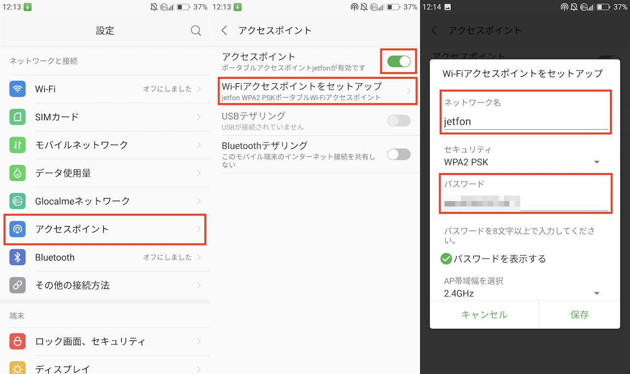 他の端末でWi-Fi接続機能を有効にし、先ほど確認したネットワーク名とパスワードを入力すれば、jetfonをモバイルWi-Fiルーター代わりにして、インターネットに接続できるようになります。