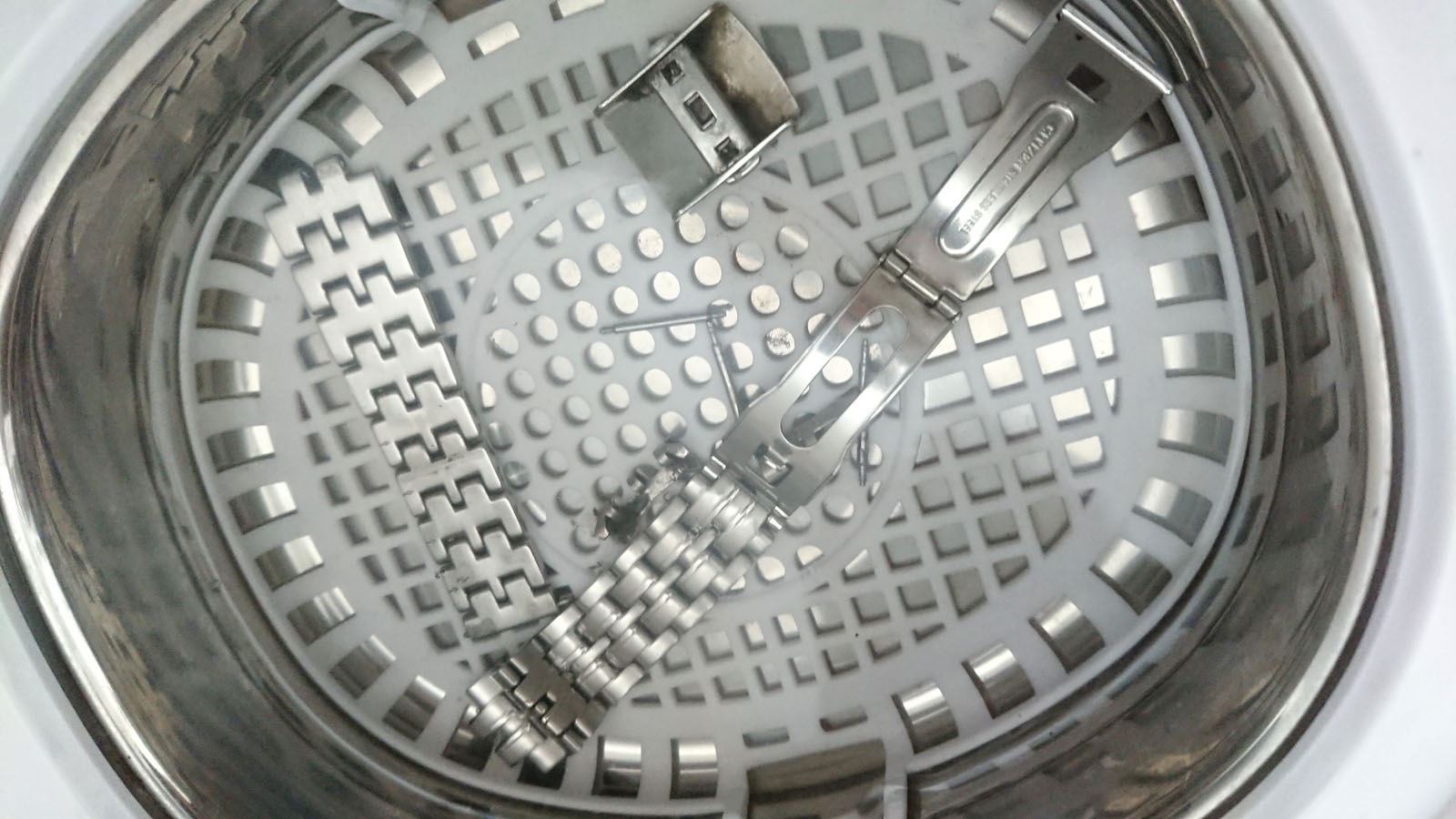ケースやメタルバンドを超音波洗浄器にかけて、汚れ落とし中。コレをやらないと中古品は着ける気が起こりません。