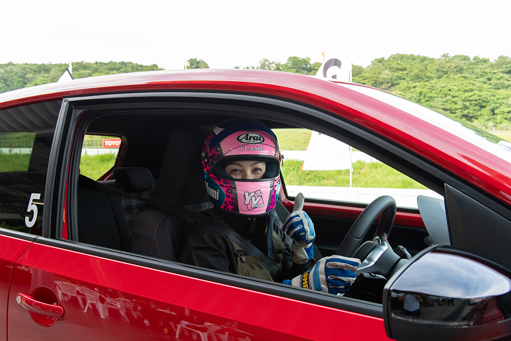 シートのホールド感はタイトですが、これが座ってみるとぴったりフィット! 体に馴染む印象です。走り出すと、驚くほど速くはありませんが、乗り心地はやや硬めでしっかりした印象。富士スピードウェイのショートコースのように、コース幅が狭く、小さなカーブが連続するコースだと、走りの安定感が際立ちます。