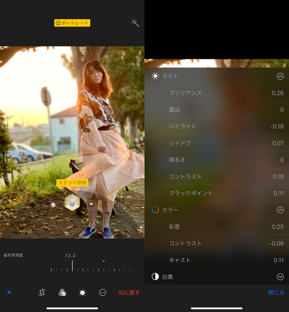 ▲編集画面で、ポートレートライティングをスタジオ照明に変更し、深度をf2.2に調整。コントラストや色味などを画面の通り追加で編集