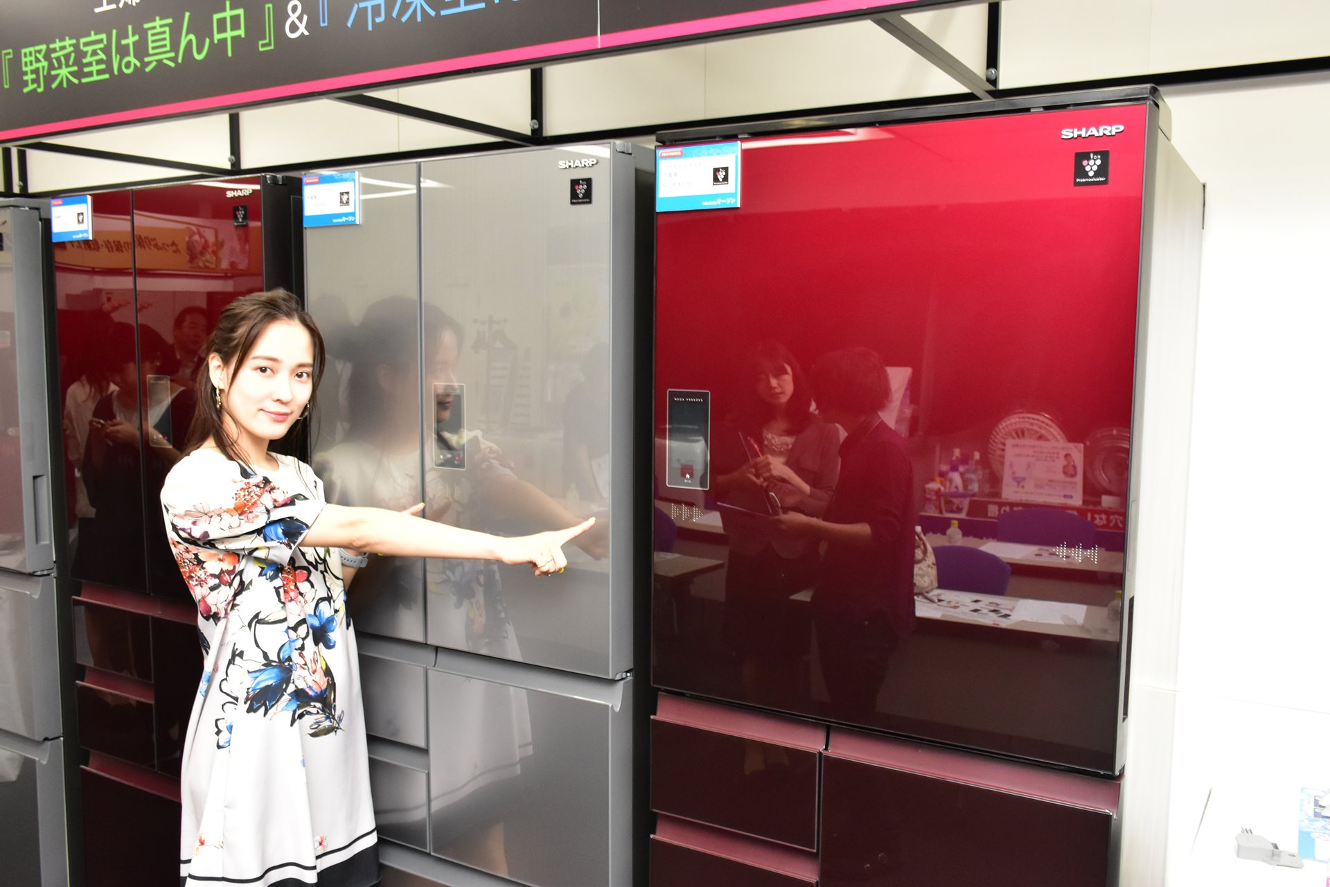 ▲シャープが2018年8月に発売したAIoTサービス対応の冷蔵庫「SJ-GX55E」(写真中央、実勢価格32万円)と、左右両開きの「電動どっちもドア」に対応する「SJ-WX55E」(写真右、同35万8000円)