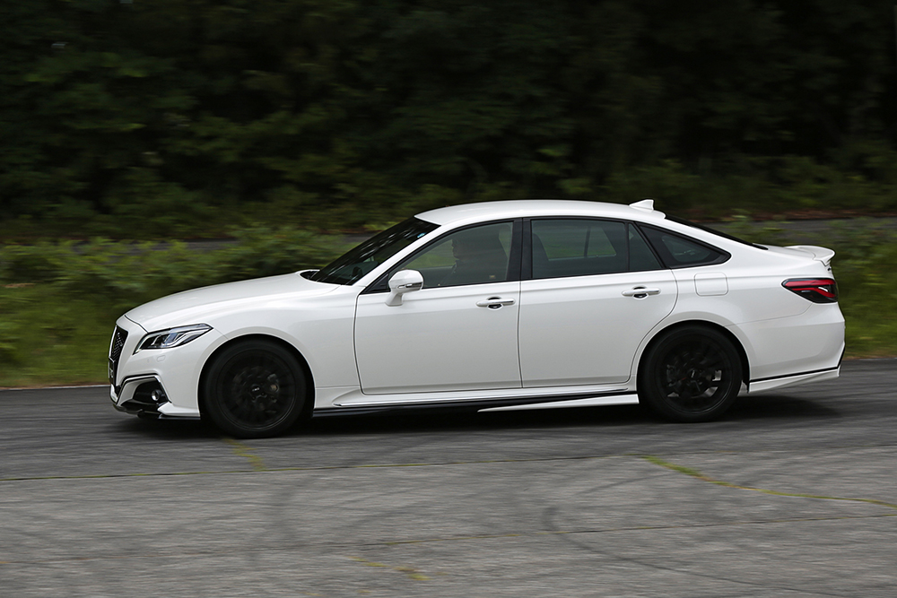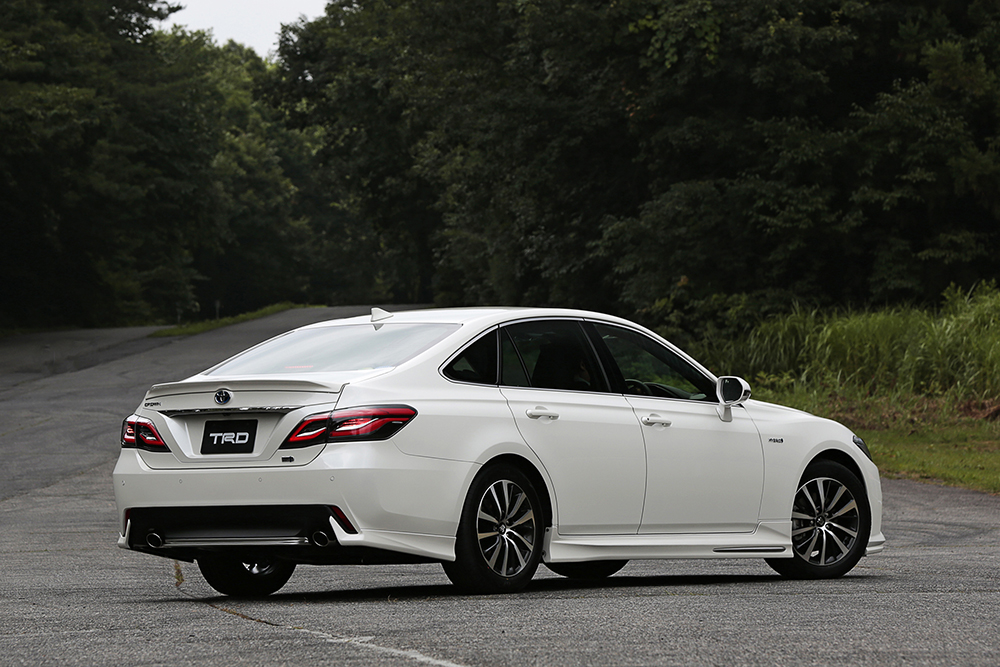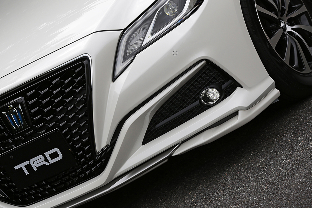 クラウン用のエアロパーツは、まずノーマルグレード向けとして、フロントスポイラー、サイドスカート、リアバンパースポイラーで構成される「エアロパーツセット」(18万5000円/税抜)を用意。さり気なく、かつ上品に、新型クラウンをドレスアップします。