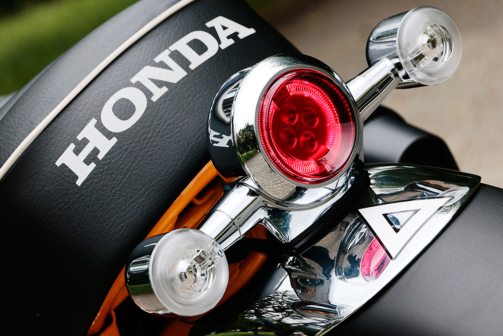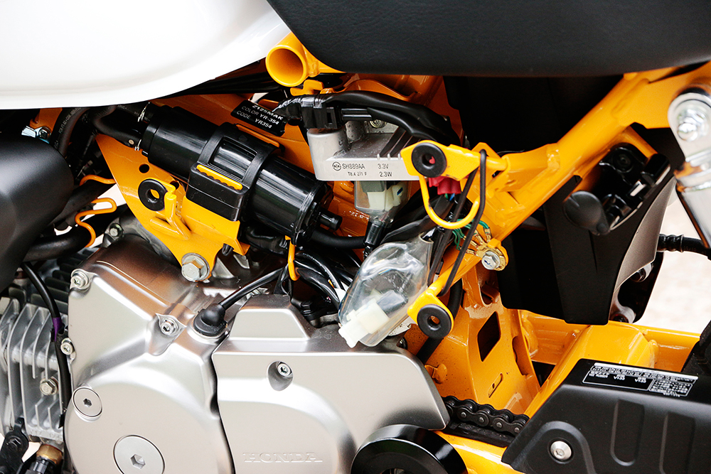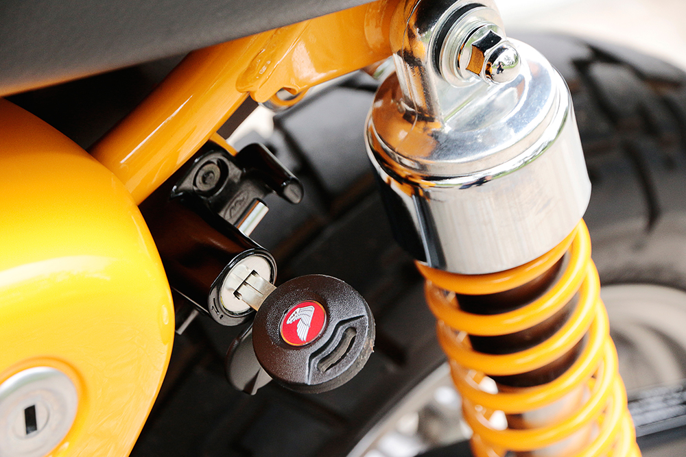 モンキー125の生産国はタイ。先行して発売され、すでに2代目となっているミニバイク「グロム」のコンポーネンツを活用して開発されました。それにしても、この2台の作り分けは、お見事! ポップでモダンなデザインをまとったグロムに対し、クラシカルなモンキー125。グロムはふたり乗りで、一体型のシートは前後に分けられています。そのためライダーは、前寄り・前のめりな感じで着座しますが、ひとり乗りのモンキー125は、クッションの詰まったシートを独り占め可能で、ゆったり座ることができるのです。
