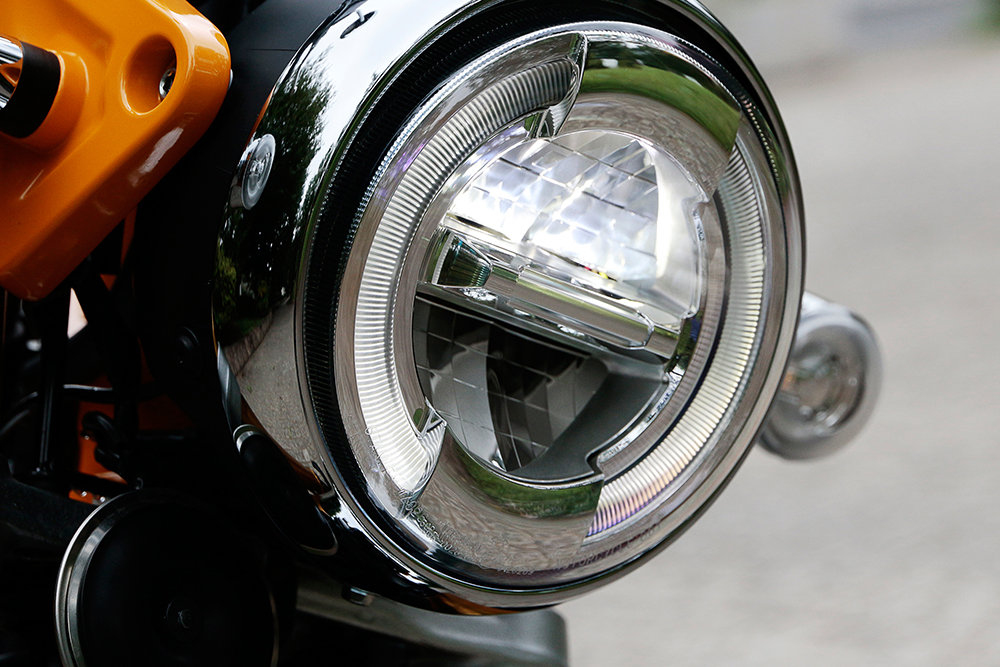 最近のホンダ2輪らしく、丸いヘッドランプは上下に分かれたLEDタイプ。上がロービーム、ハイビームでは上段に加えて下段も点きます。新型モンキーは、リアランプ、それにウインカー類もLEDという豪華さ。長い寿命を期待できるので、メンテが楽そうですね。