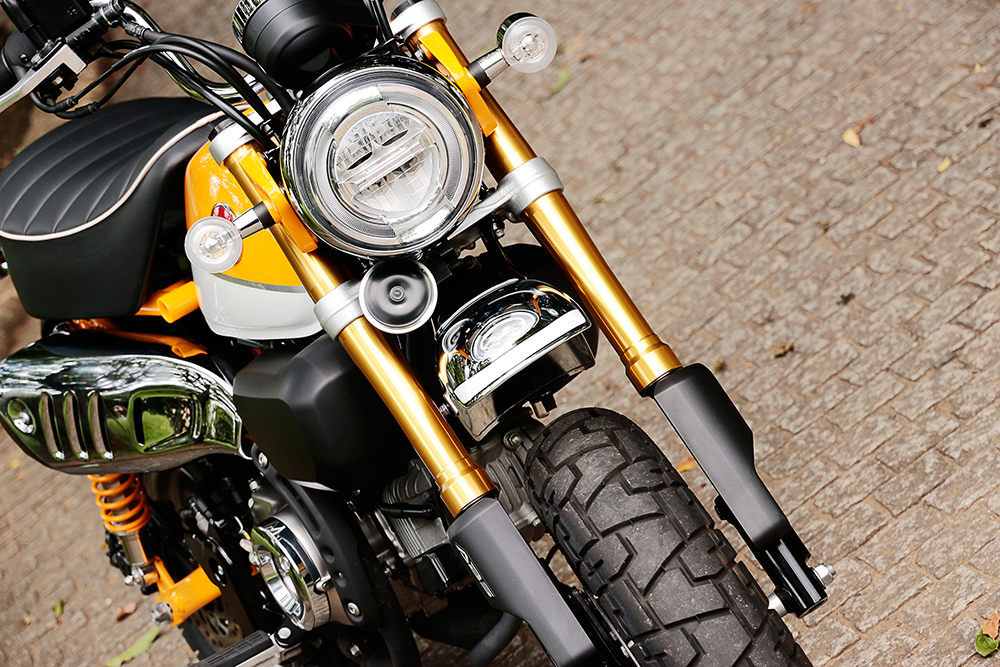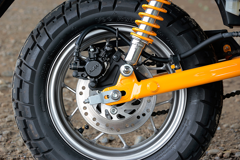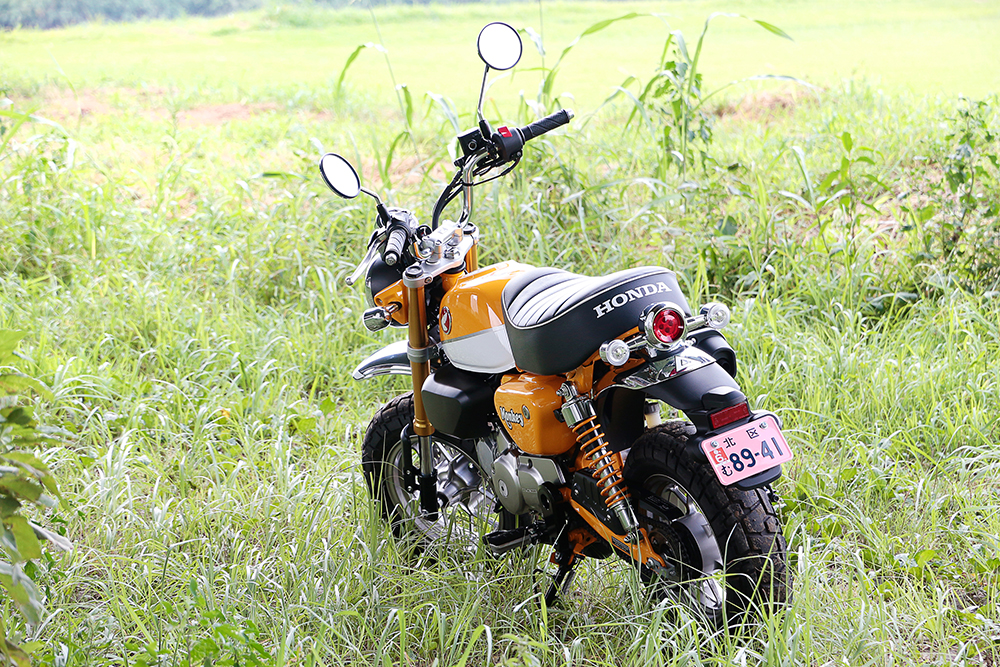 キャスター角はいずれも25度ですが、モンキー125のタイヤは、グロムとサイズこそ同一ながら、扁平率が70から80へと厚くなっています。ブロックの荒いむっちりしたルックスが、のほほんとしたモンキーの外観にマッチしているだけでなく、バイクをロールさせる際に若干の抵抗を感じさせます。