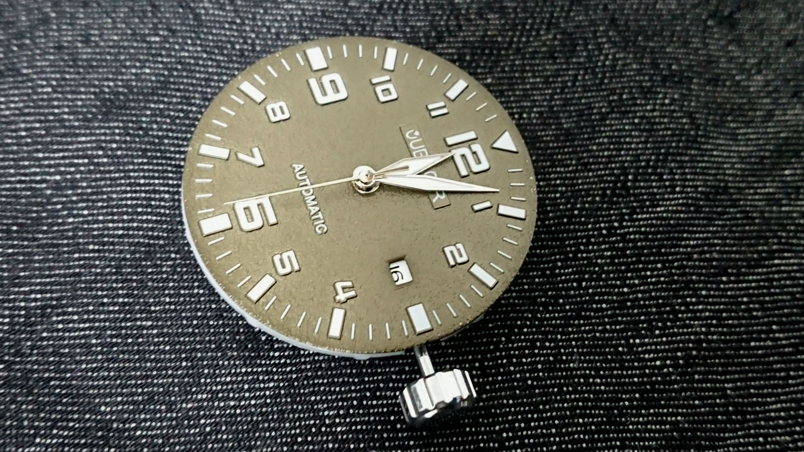 今までも、説明画像と実物で裏蓋やシースルーバックから見える中身のムーブメントの形状が異なっているなどの経験はありました。ですが、視覚的には一番目立つ箇所に入っている、文字盤のブランドロゴが異なっていたのは初めてです(笑)。