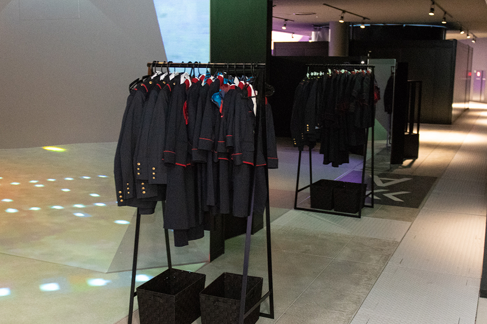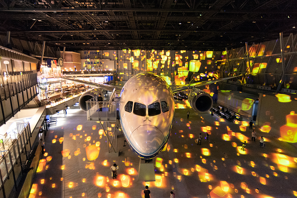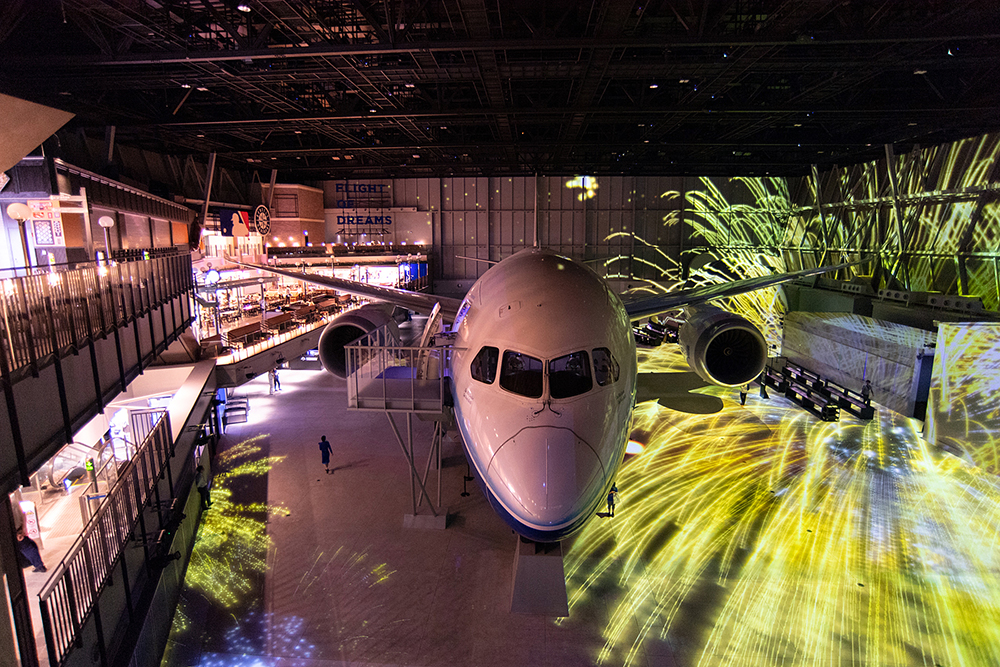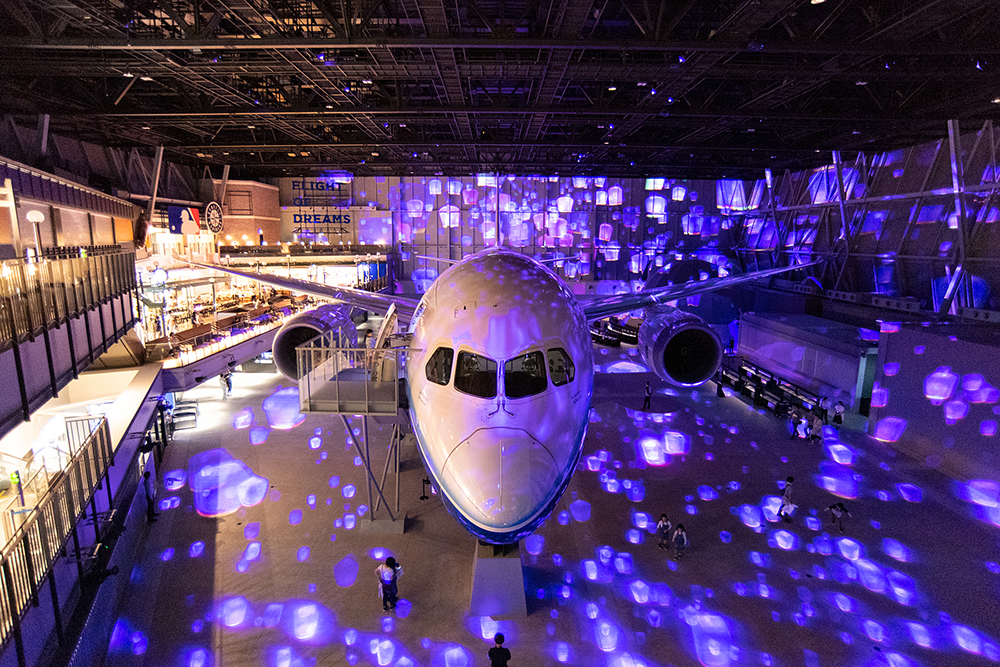 プロジェクションマッピングを活用した映像と音のショーを、1時間に2回実施。さまざまなデジタルアートを手掛けるチームラボが制作したコンテンツで、色鮮やかな光による演出により、787とともに宙に浮かんでいるかのような感覚を楽しめます。