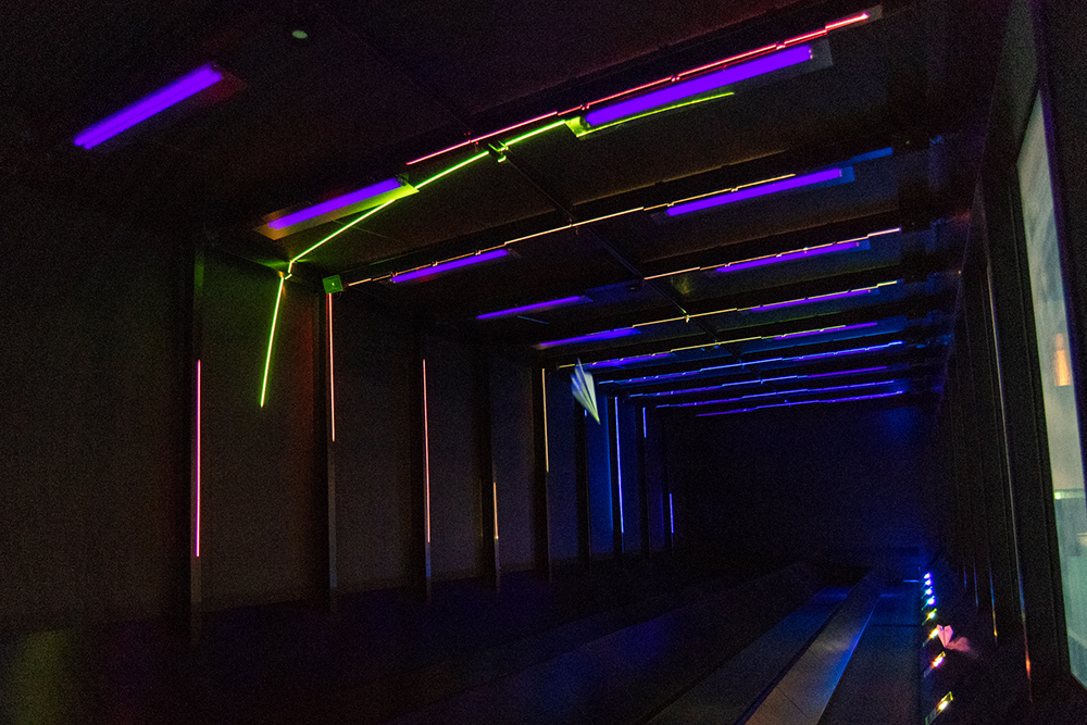 紙ヒコーキを折って飛ばす体験型コンテンツ。飛ばした紙ヒコーキがエリア内の光に触れると空間の色が変わり、サウンドによる演出も。どうすれば紙ヒコーキが遠くまで飛ぶのか、親子で楽しみながら学べます。
