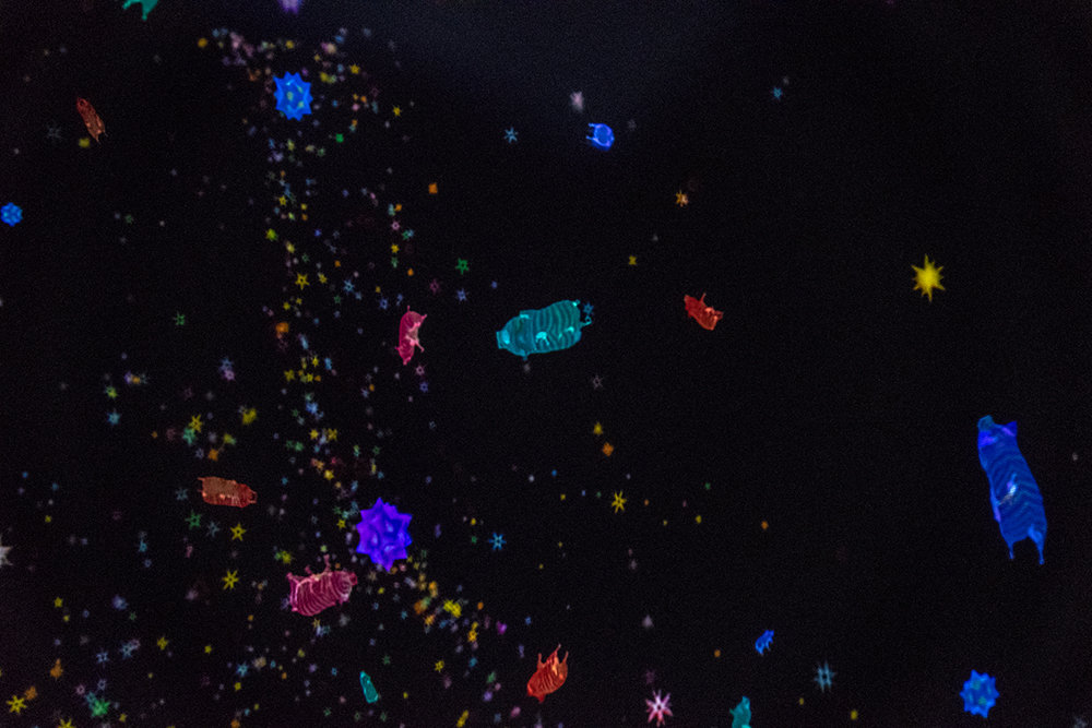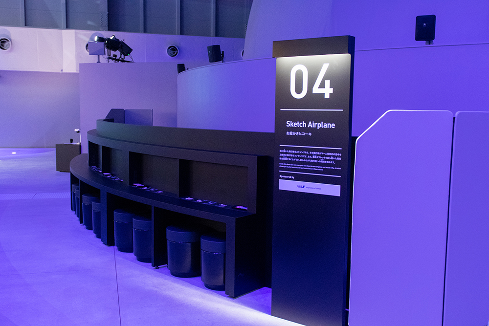 絵に描いた飛行機をスキャンすると、その飛行機がドーム内の空中を飛び回るユニークなコンテンツ。空中には星や花のほか、愛らしいブタなどの隠れキャラも。