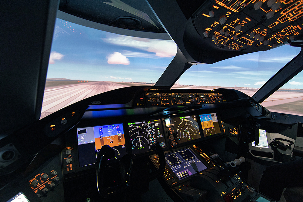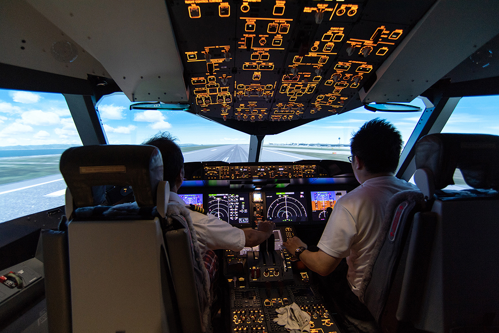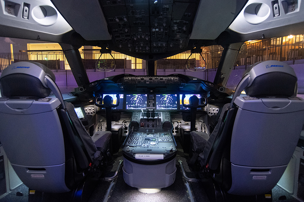ボーイング787のコックピットを忠実に再現したシミュレーター。インストラクターの指導もあり、離陸から着陸までの操縦を体験することができます。