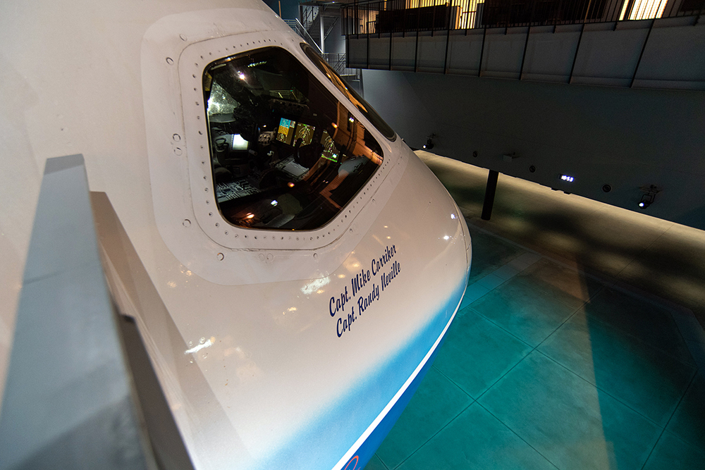 最近は保安上の問題もあり、なかなか見ることができない旅客機の操縦室。フライト・オブ・ドリームズではガラス越しではあるものの、ZA001のコックピットを間近に見ることができます。大型ディスプレイがズラリと並び、ペイロットの眼前にはヘッドアップディスプレイも備わる最新鋭機の操縦室は、まさに圧巻のひと言。コックピットウインドウの下には、2009年12月15日のZA001の初飛行、そして、セントレアへのフェリーフライトを担当したテストパイロット、マイク・キャリカー機長とランディ・ネヴィル機長の名前が記されています。