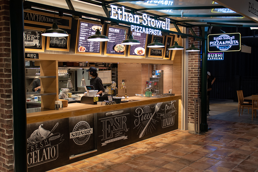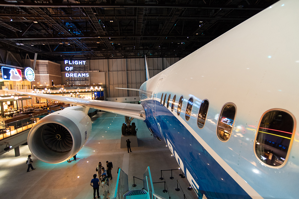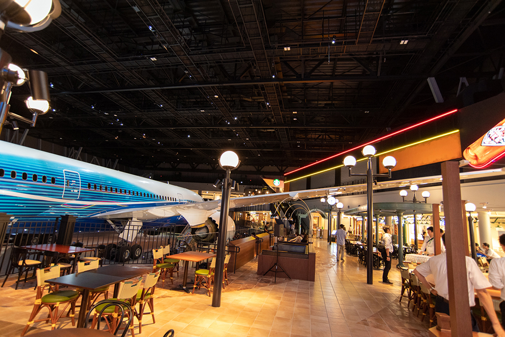 シアトルテラス<入場無料>は、ボーイングが創業した都市、米・シアトルにちなんだエリアとなっていて、食事やショッピングを楽しめるゾーン。ピザやアメリカン料理など、日本初出店となる飲食店も多く、787を間近に眺めつつ、本場の味を堪能できます。