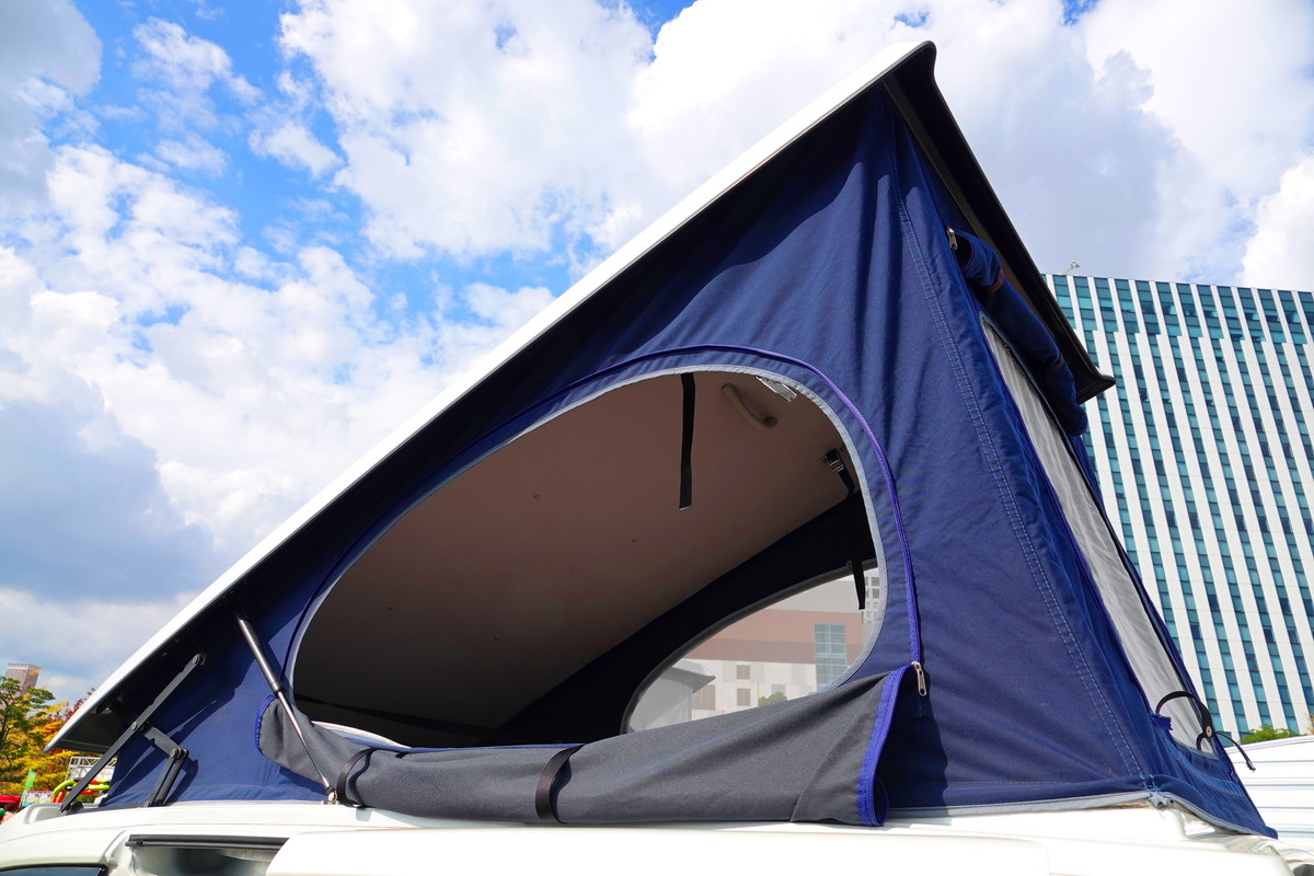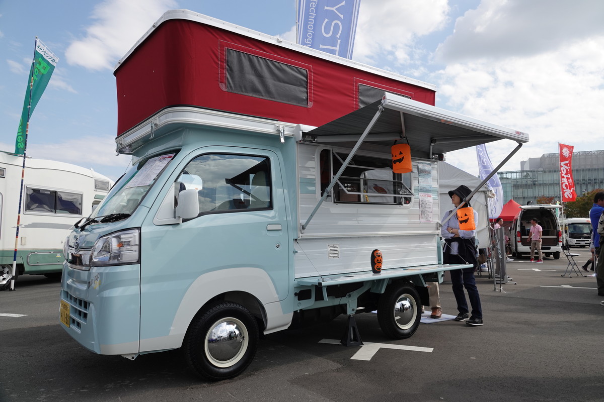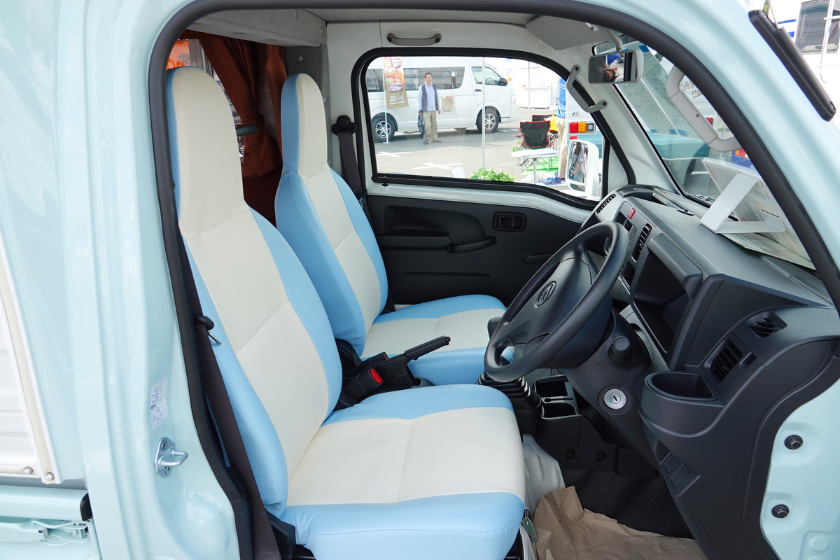 一人旅を楽しむ人や定年退職した夫婦から人気の高い軽キャンパー。軽キャンパーといえばワンボックスタイプのバンを架装したものが主流ですが、「mini pop Bee」は軽トラをベースにしているところがミソ。しかも荷台の上に載せたシェルをボディと一体化。キャビン後方をくり抜いてシェルと繋げています。さらにキャンピングカー登録(8ナンバー)することで、軽トラベースながら4人乗りになっています。ベース車両はダイハツハイゼットです。