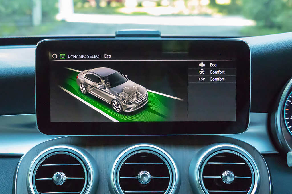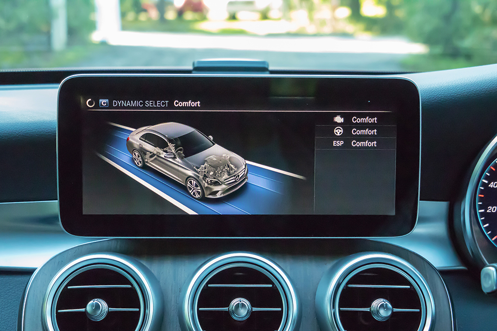 液晶メーターパネルのメリットは、なんといっても表示の自由度が高いことだが、新型Cクラスの場合、アナログ針のない12.3インチのフル液晶パネルに、速度計やエンジン回転計のほか、各種車両情報や地図情報などを表示させられる。その隣にある、ナビゲーション機能などを表示するセンターディスプレイも、従来型より大画面かつ横長(10.25インチ)に。フル液晶メーターパネルとの相乗効果で、インテリアの先進性は大幅にアップした。
