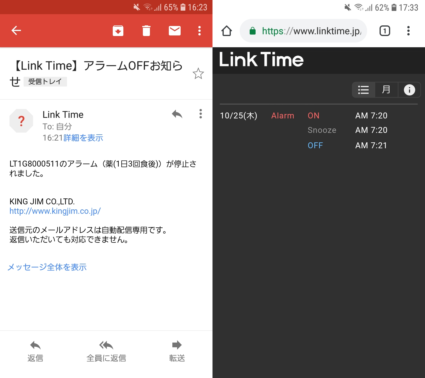 Link Timeもうひとつの特長は、アラームを止めた履歴を共有できるところ。アラームを止めたことをメールで知らせたり、専用ページで確認したりできます。