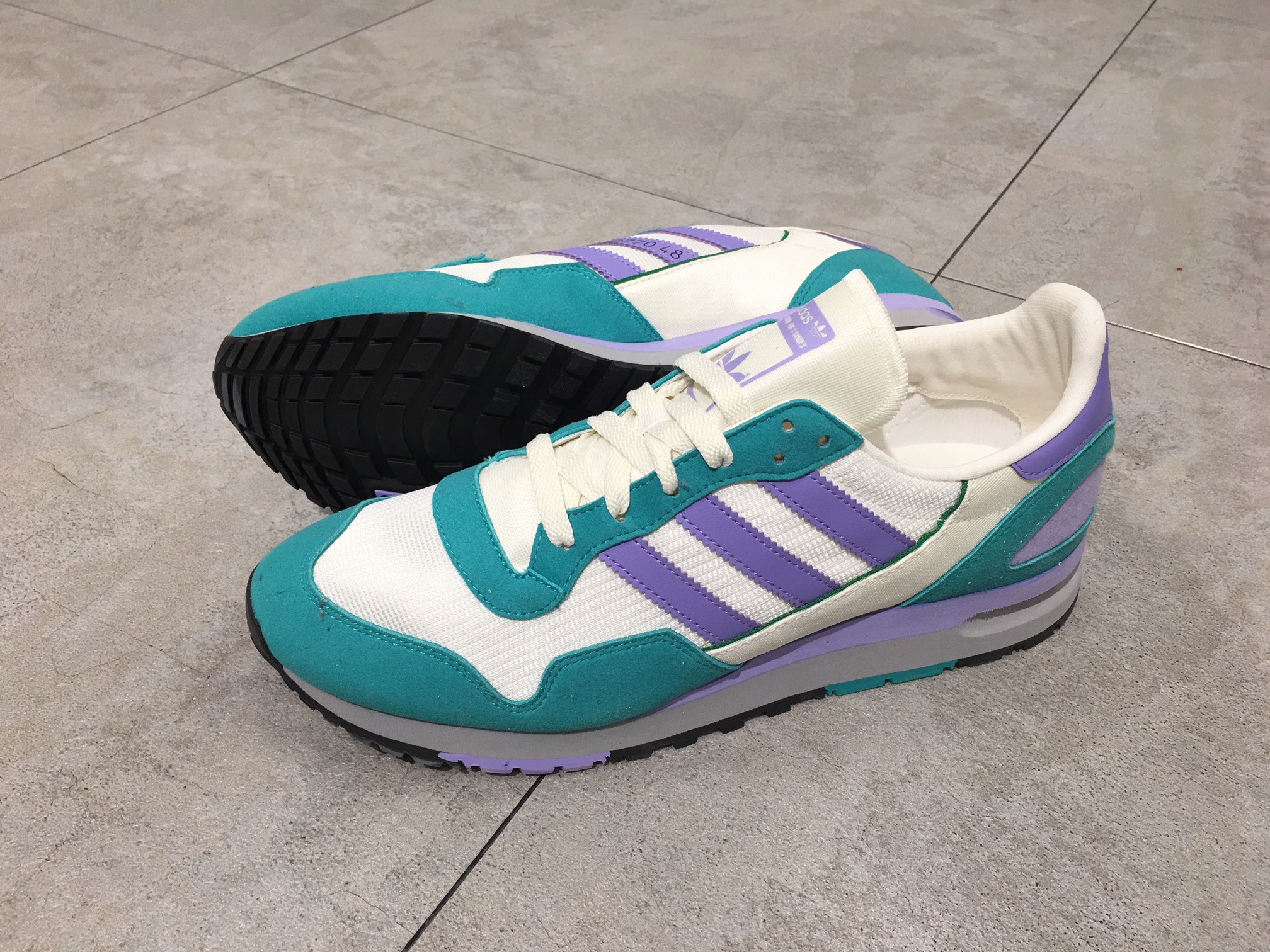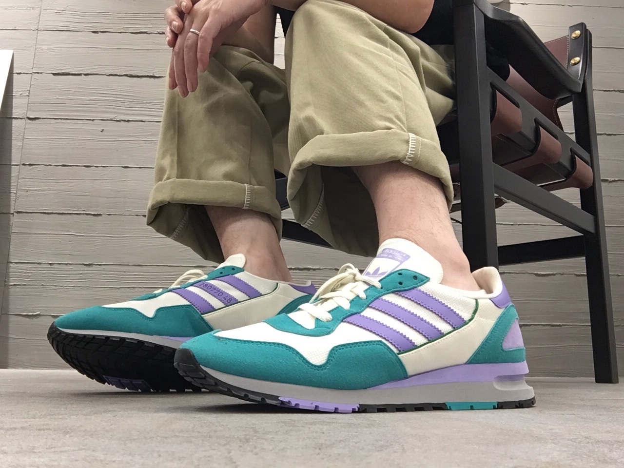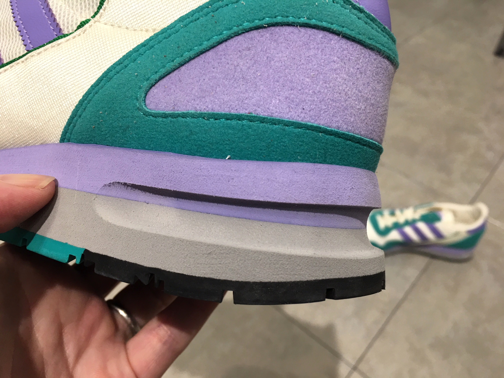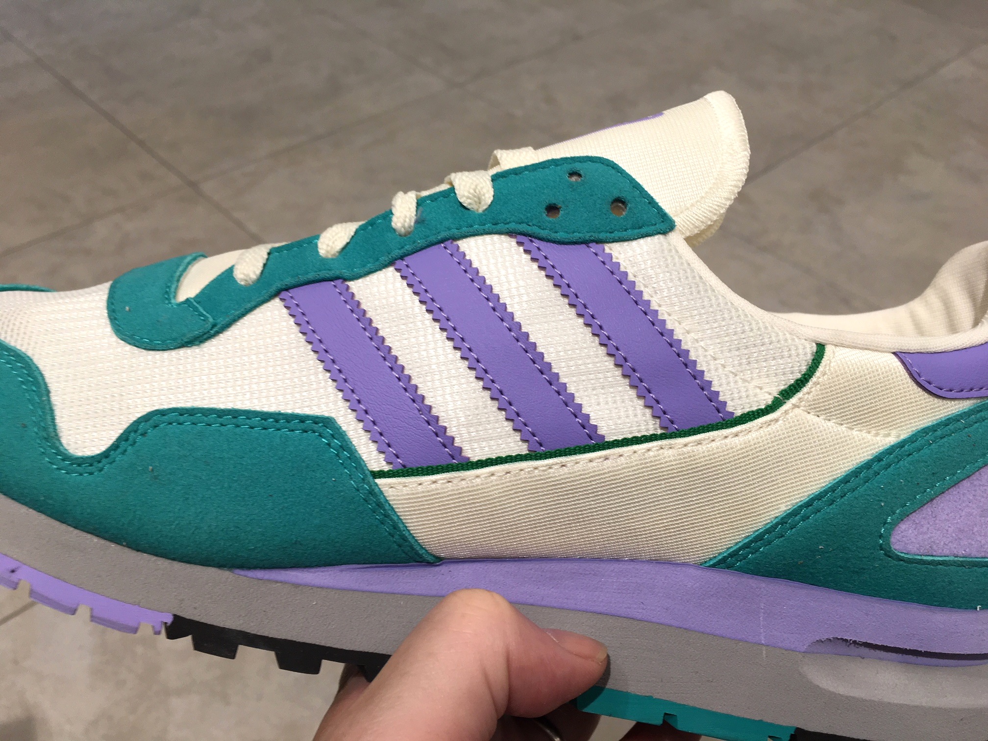 パープルの挿し色がレイブっぽさを押し出しています。そしてアディダスならではのスリーストライプスのエッジはギザギザにして、クラシックな雰囲気も加えられています。