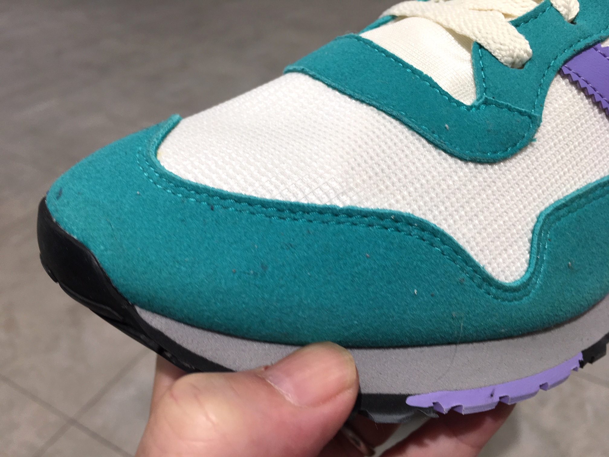 ソールは軽量なポリウレタンを採用。ミッドソールはパープルとグレーの2層構造と、’90年代らしい手の込んだ作りもポイントです。