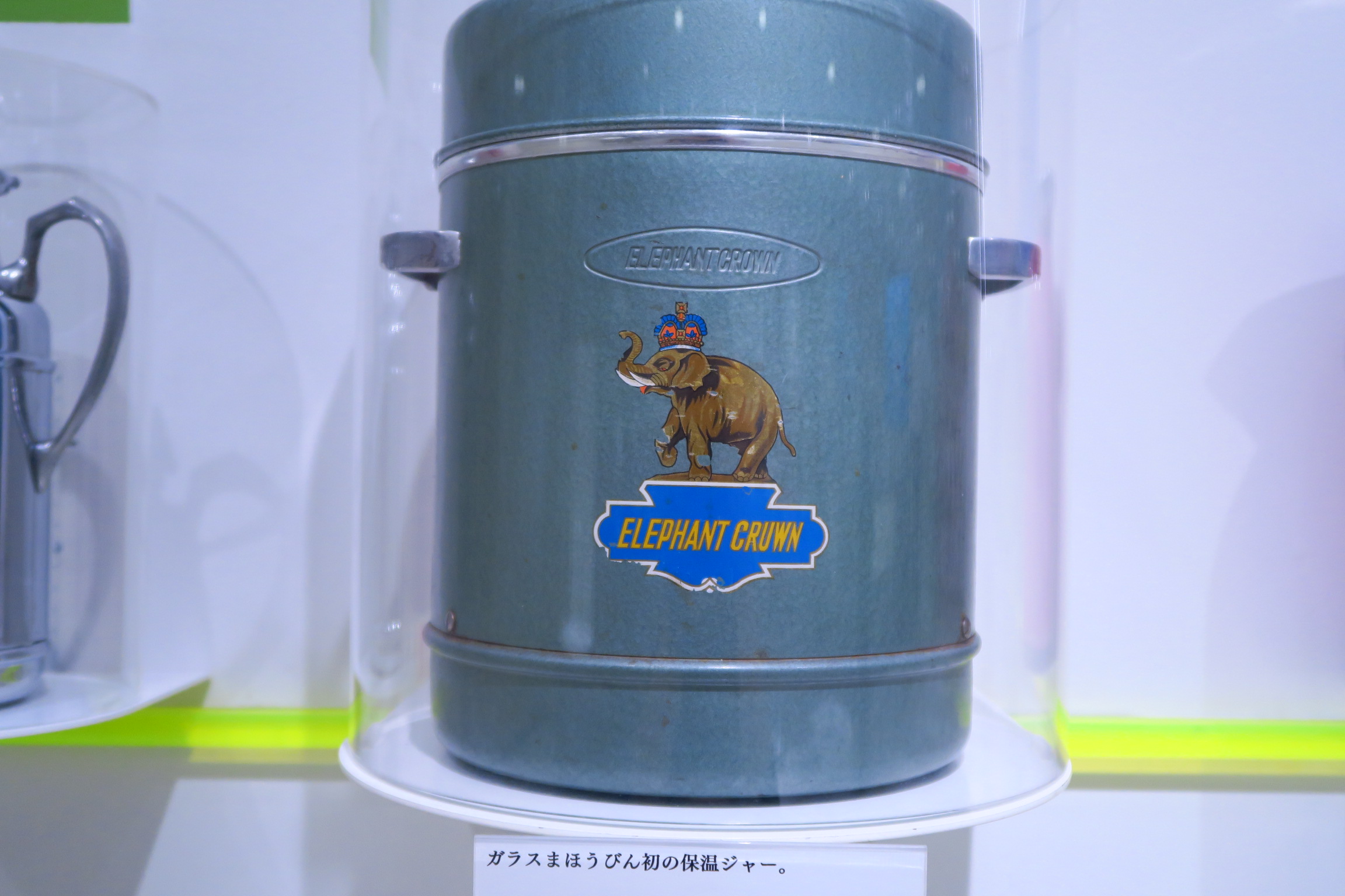 ▲ガラスまほうびん初の保温ジャー。象印のロゴがいまとはまったく異なる