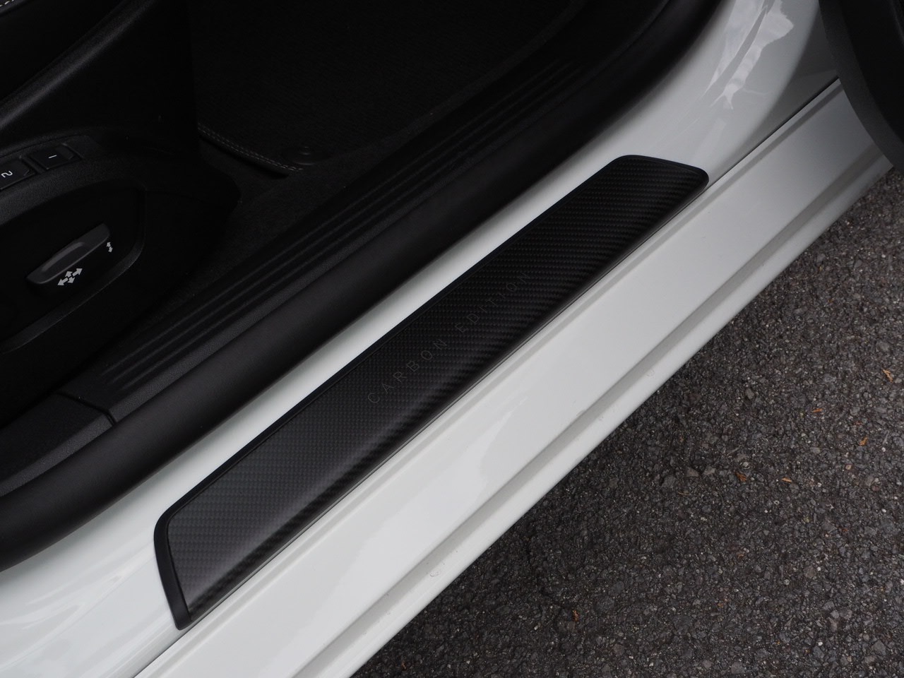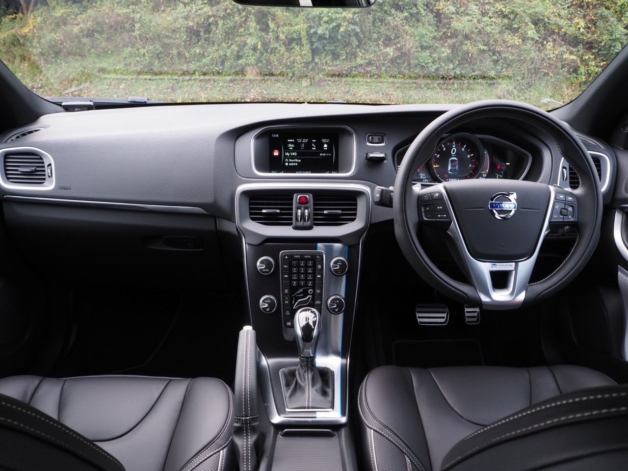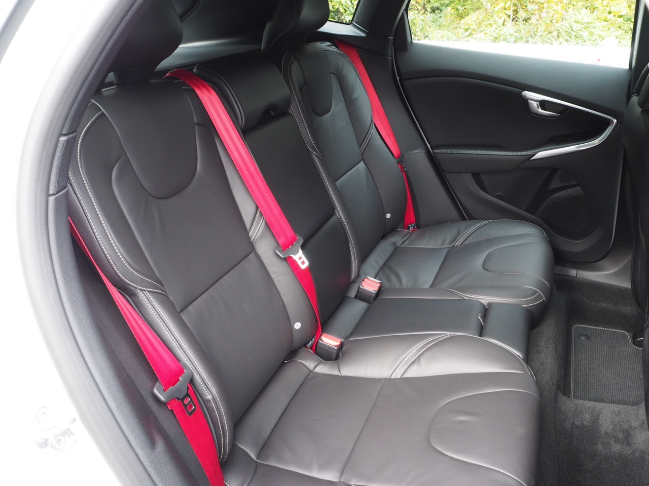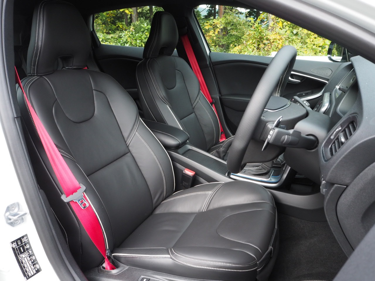 V40 T5 R-DESIGN カーボンエディションは、その名のとおり、随所にカーボン素材をおごった特別仕様車です。カーボンファイバー製のドアミラーカバー、フロントスカッフプレートなどに加え、グロッシーブラックのサイドウインドートリム、リアディフューザー、テールパイプ、フロントバンパー・トリム、アルミホイールを採用。そして、シートベルトは派手なレッドに彩られています。