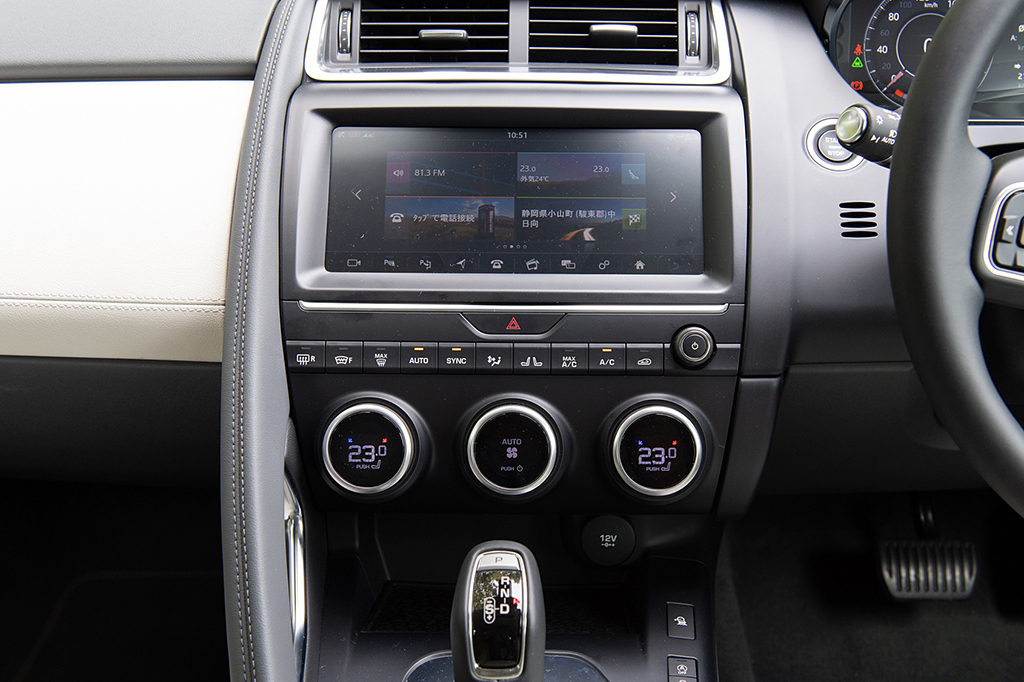 そして、ドライバースシートに収まり、まず感心させられるのが、ジャガーの空間設計の巧みさ。SUVですから、ヒップポイントは高めに設定されていますが、体から前に伸びる手足の角度はスポーツカーやサルーンのそれに近く、自然なドライビングポジションをとることができます。一方、キャビンの天地が足りないとか、タイトに感じるといったことはなく、フロントシートのスペースに関しては、程良い包まれ感という塩梅です。