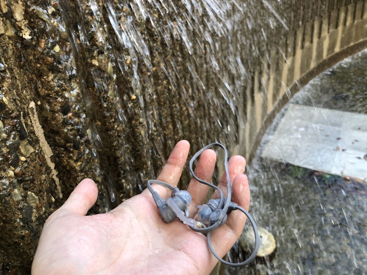 またIPX7相当の防水にも対応しています。容赦なく公園の水でバシャバシャと濡らして、水たまりに沈めてもみましたが、濡れたままでも支障もなく使えました。普段の音楽リスニングでも用いる“イヤージェル”でも防水になっているので、突然の雨でも安心ですね。