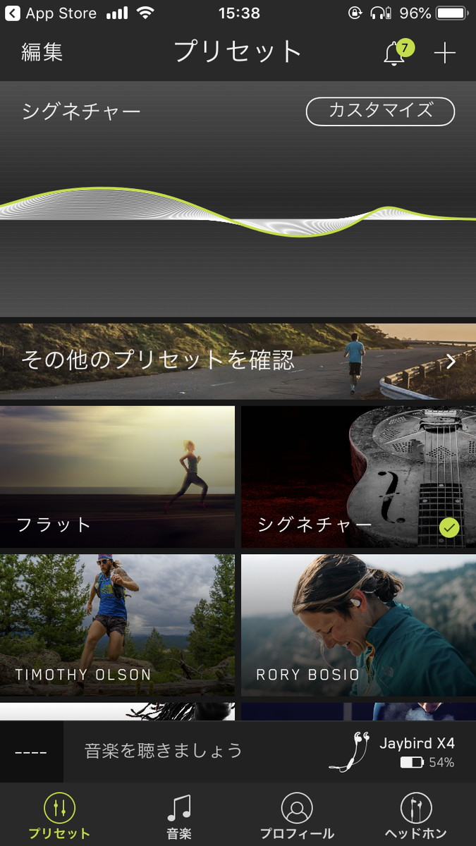 そして「X4」ユーザーに推奨したいのはアプリ「Jaybird My Sound」の活用。イコライザでサウンドのカスタムも可能です。特にオススメしたいのが過去のJaybirdのイヤホンに近い“シグネチャー”のセッティング。声もクリアで低音も気持ちよく響きます。スポーツ用イヤホンでこのサウンドなら満足感ありますよ!