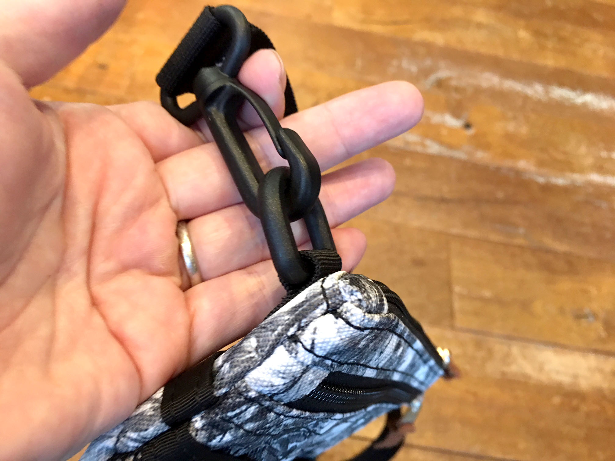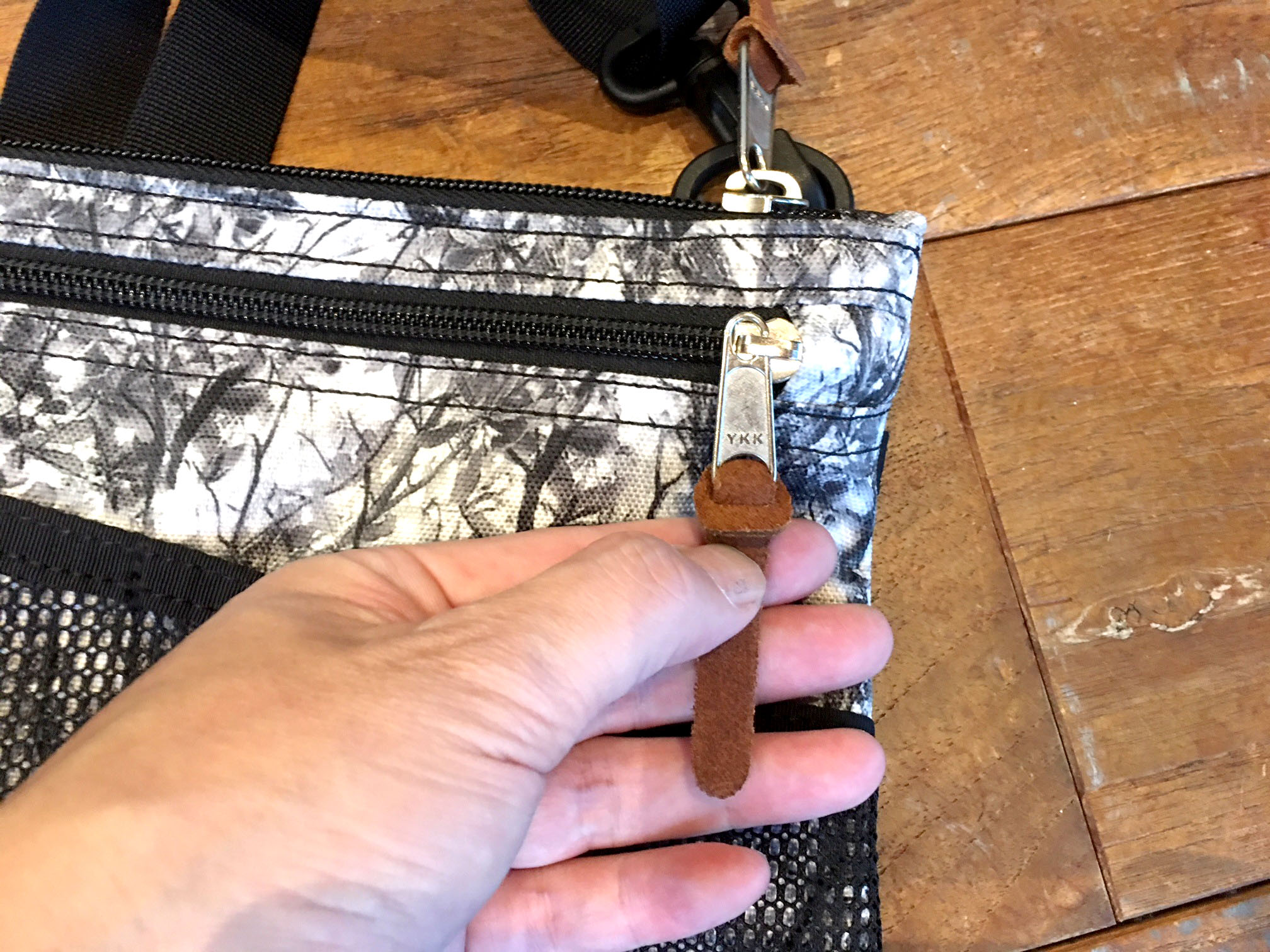 ファスナーのスライダーにも、バックパックと同様のレザーストラップが装着されています。グローブを着けながらでもつまみやすく、開閉がラクチン。