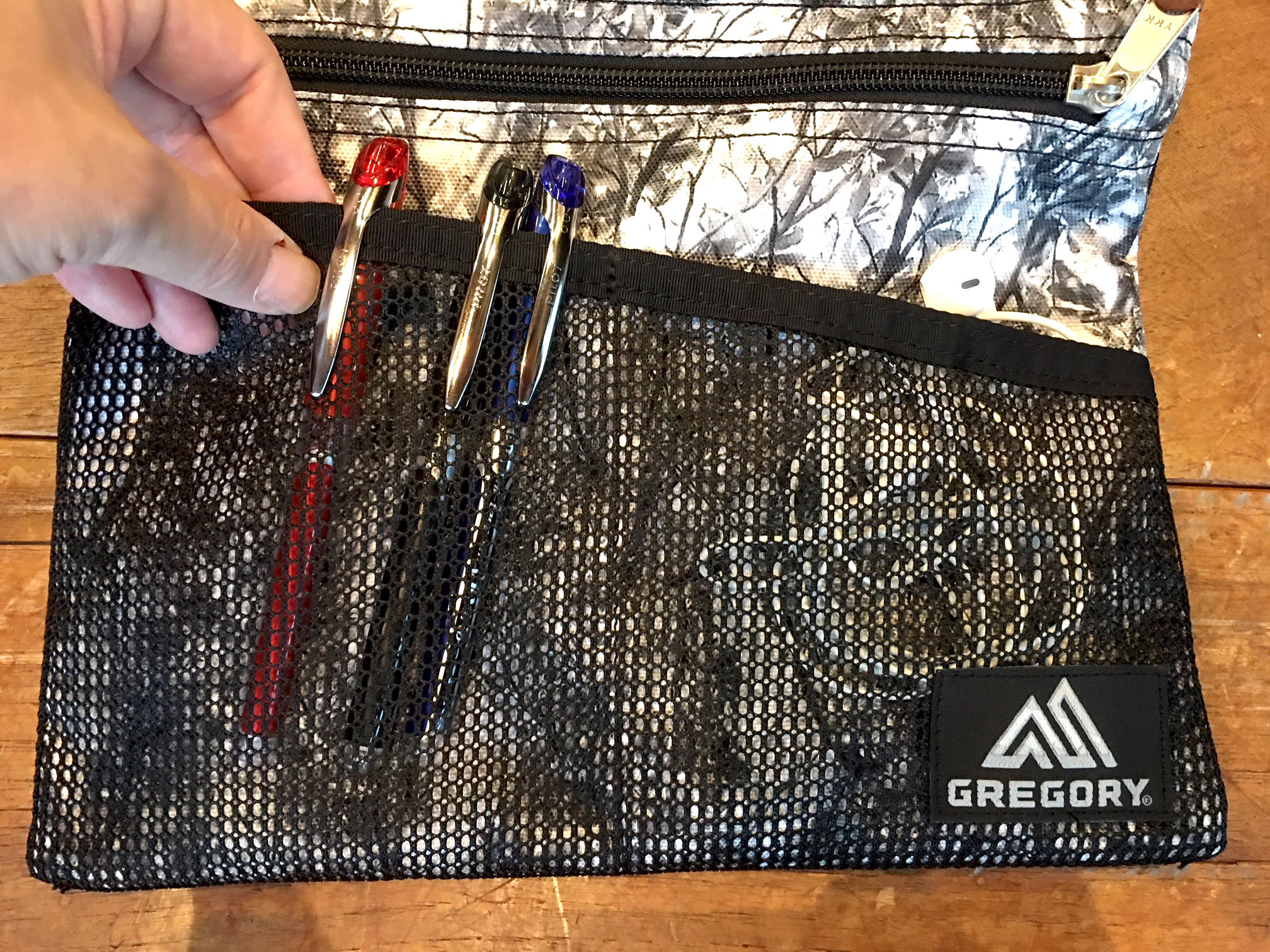 デザインのポイントとなるフロントのメッシュポケット。グレゴリーのバックパックに付いているフロントポケットから継承した斜めのカッティングが特徴的です! 斜めにカットしてあることでアプローチ面積も広がり、使い勝手が向上しています。