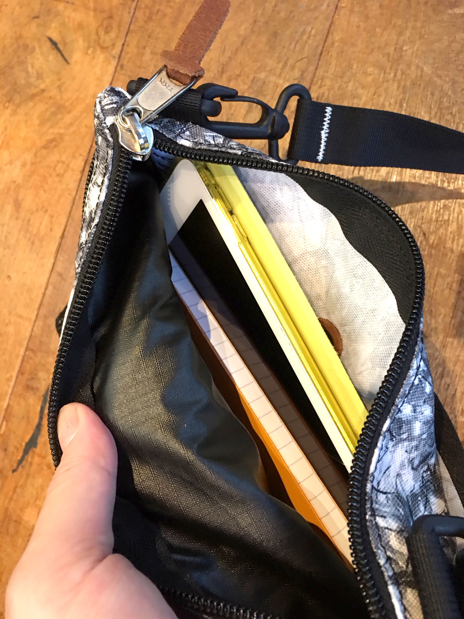メインコンパートメントはW27×H20cmで、iPad miniぐらいのタブレットならラクラク収納できちゃいます。マチがないサコッシュだからシルエットがスッキリする点はやはり魅力的です。