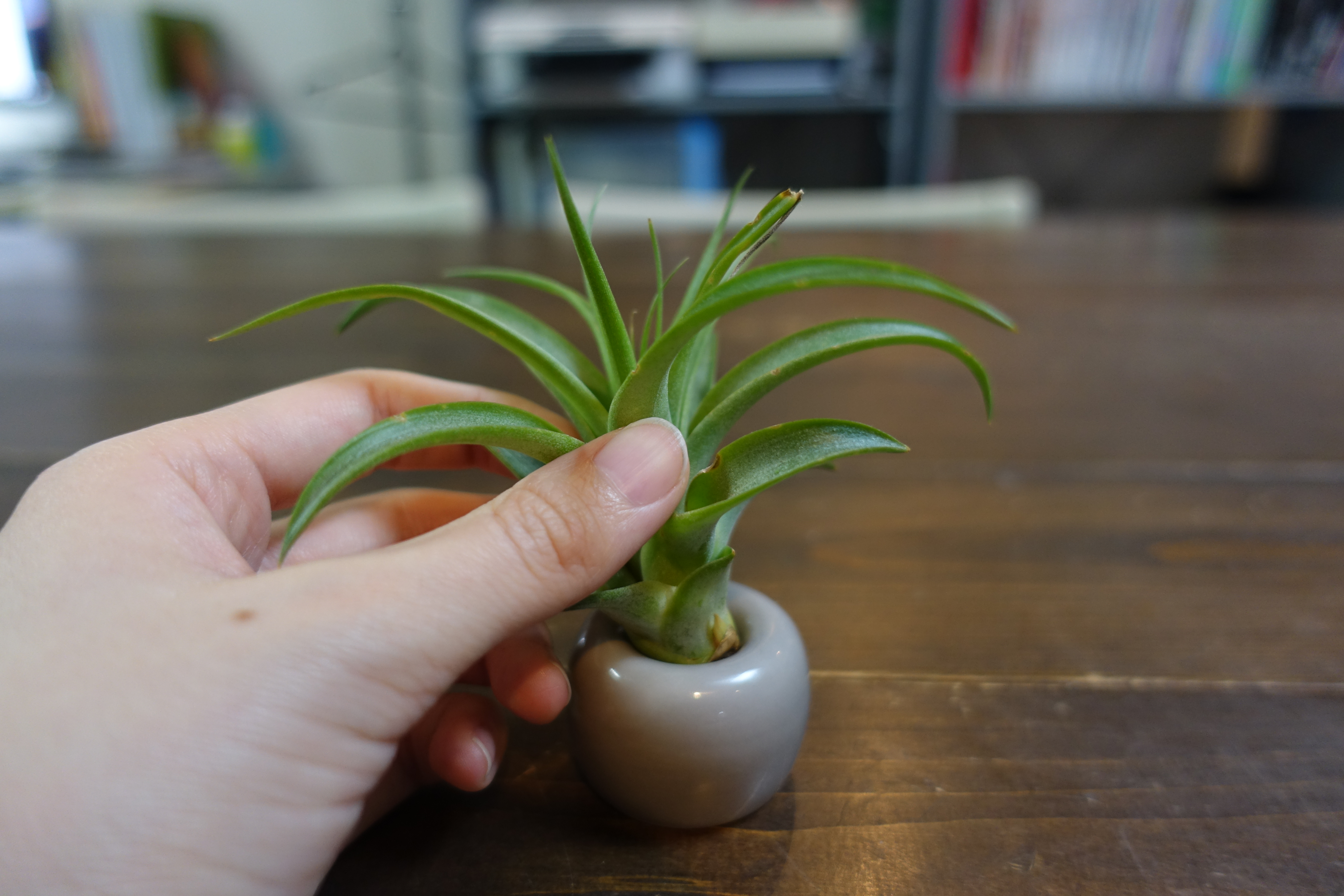 ▲小ぶりのエアプランツを挿入。ぴったりはまり、歯ブラシスタンドの落ち着いた色合いともマッチする