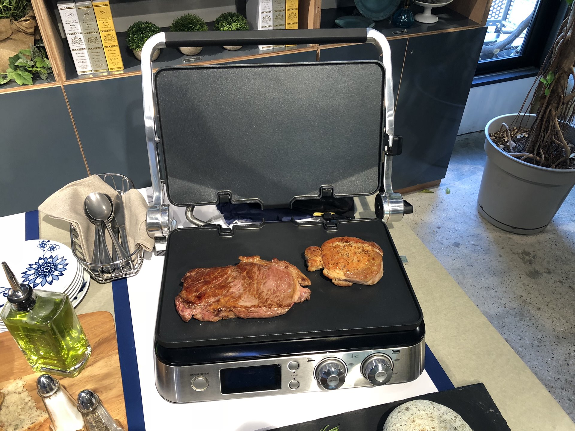 奈津子:「挟む」、「開く」、「浮かせる」の3つのポジションが可能という、今までにない調理家電なんです。上面と下面両方のプレートにヒーターを内蔵しているので、従来のホットプレートよりも約20%時短につながるそうです。