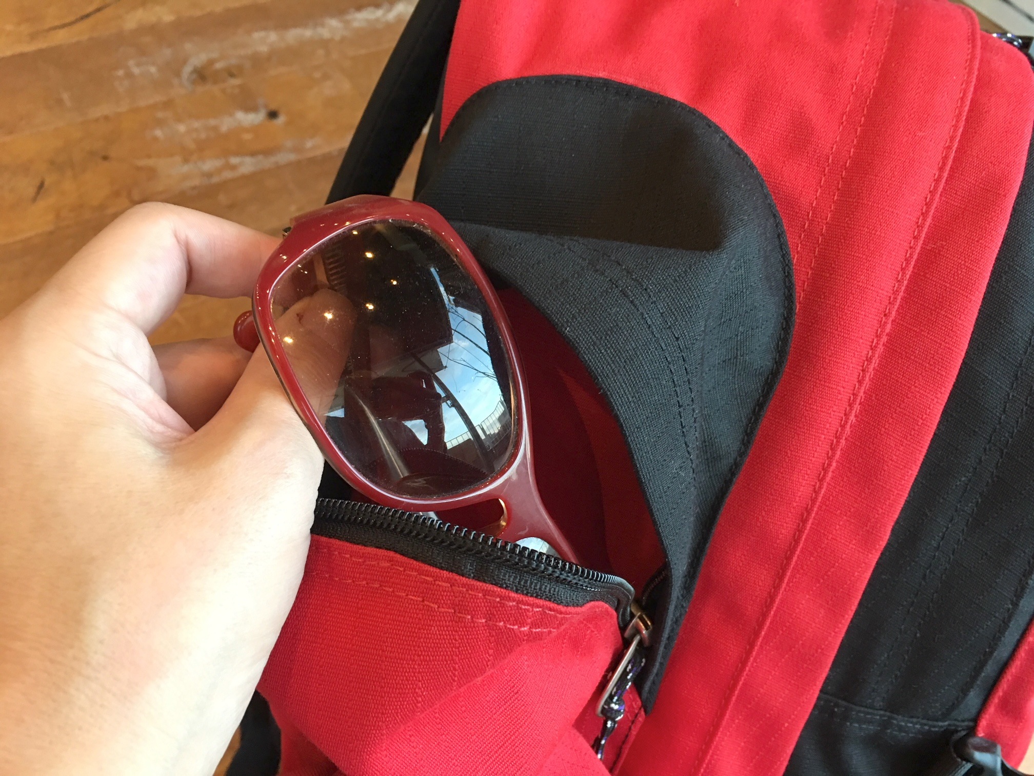 両サイドにもファスナー付きポケットがあります。背負ったままアクセスできるので、ボトルホルダーにも使えるし、サングラスをササッと出し入れするのにも便利です。