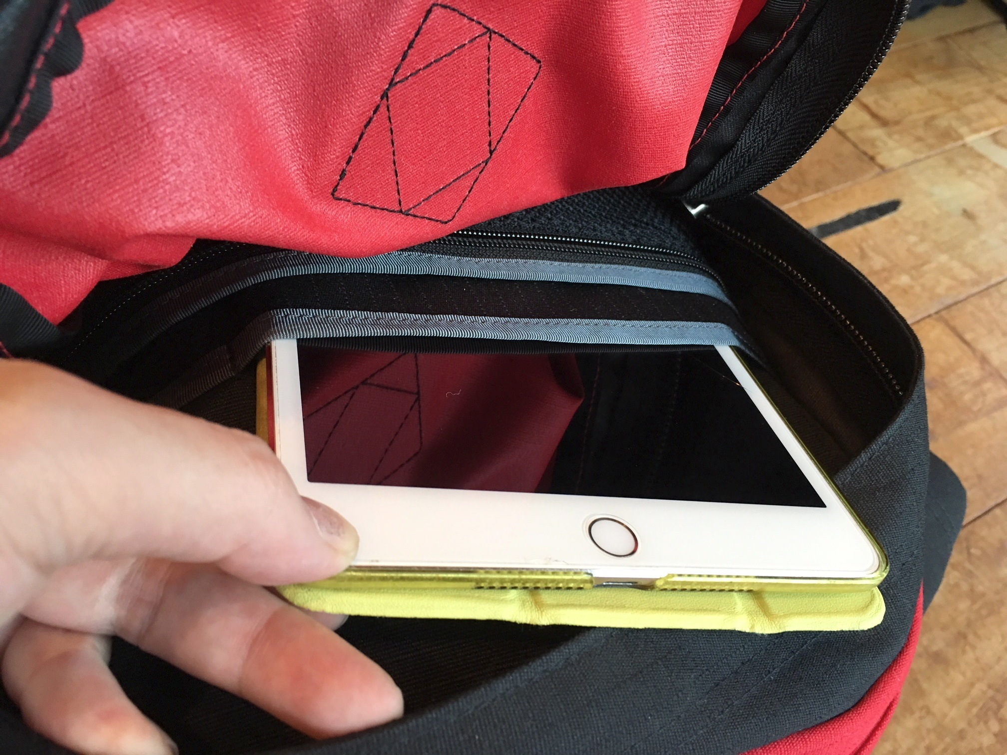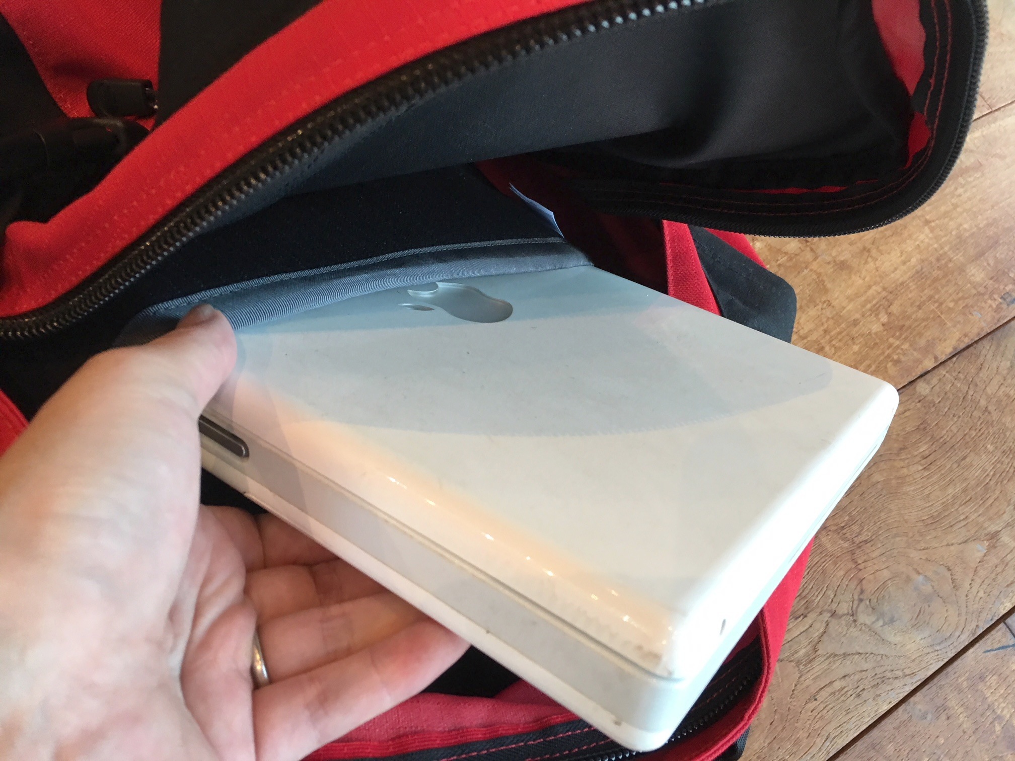 そしてメインコンパートメント内部には、背中側に15インチまでのノート型PCやタブレットなどの電子機器が収納できるパッド付スリーブを装備。ワタクシ愛用のブ厚いクラシックiBookもラクラク収納できちゃうのがうれしい!
