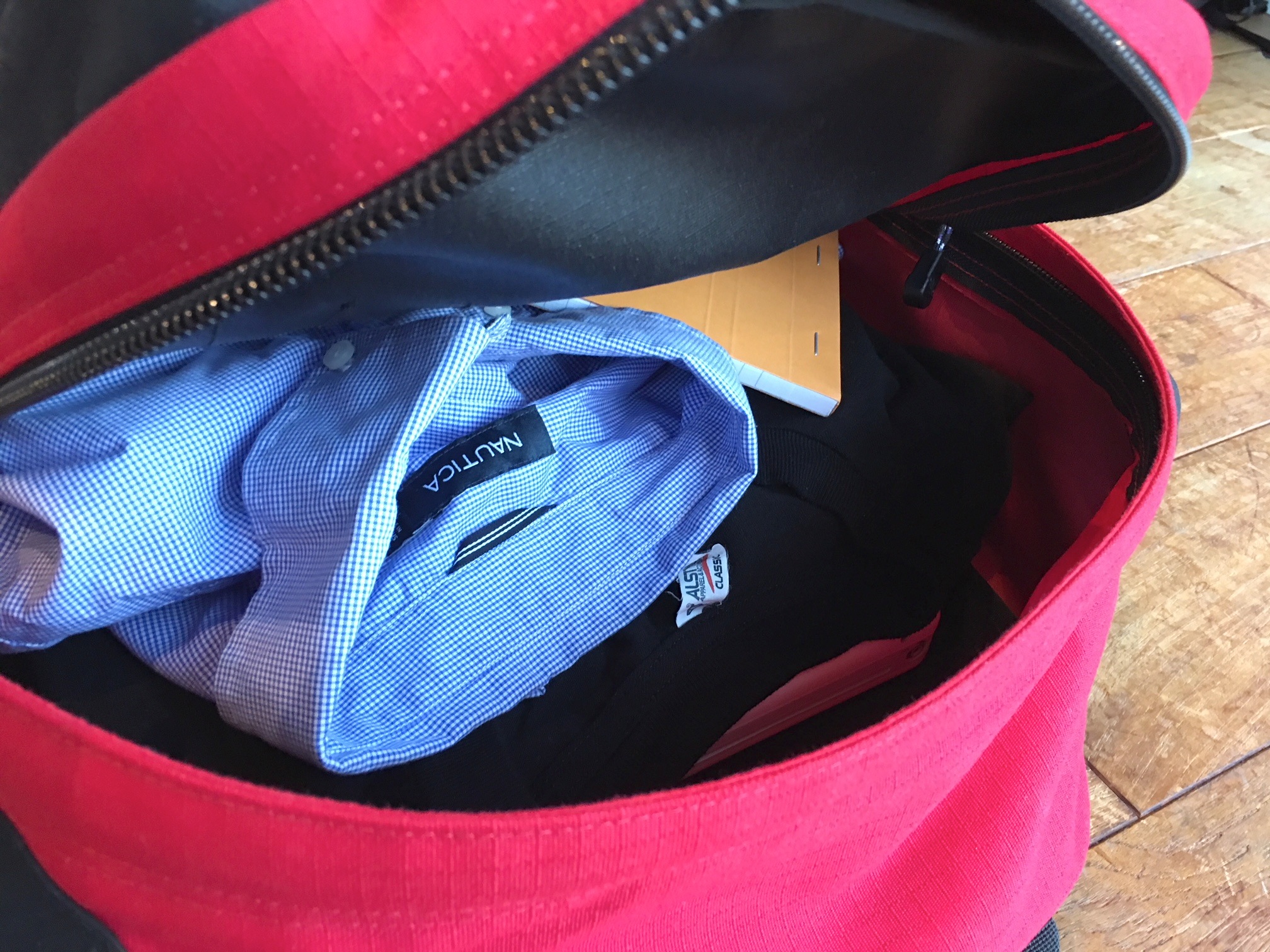 メインコンパートメントは、’90年代パイセンがレコードバッグに使っていただけあり35Lと大容量。トレッキング用のレインウエアや着替えのシャツ、Tシャツなどをガンガン詰め込めます。二泊三日くらいの旅行も全然行けちゃいます。