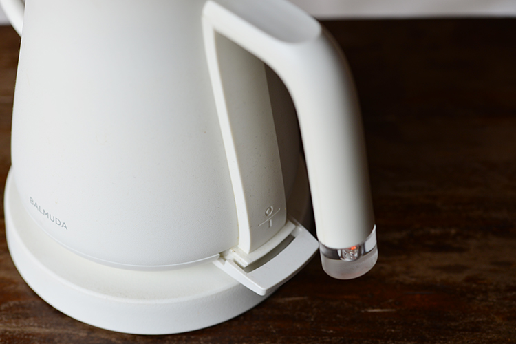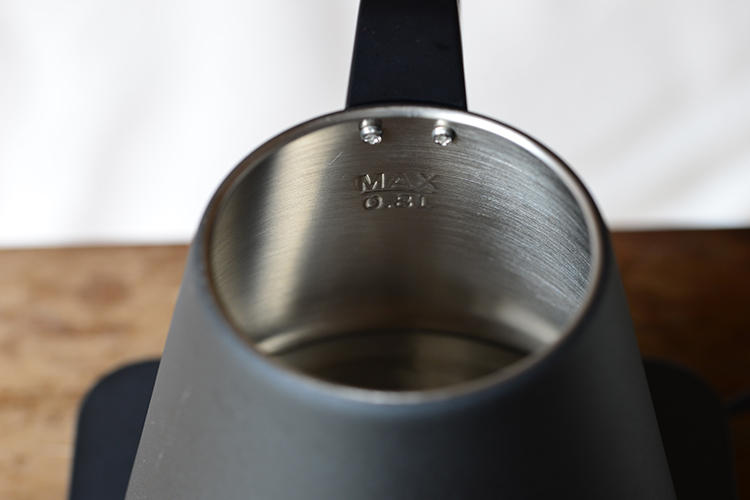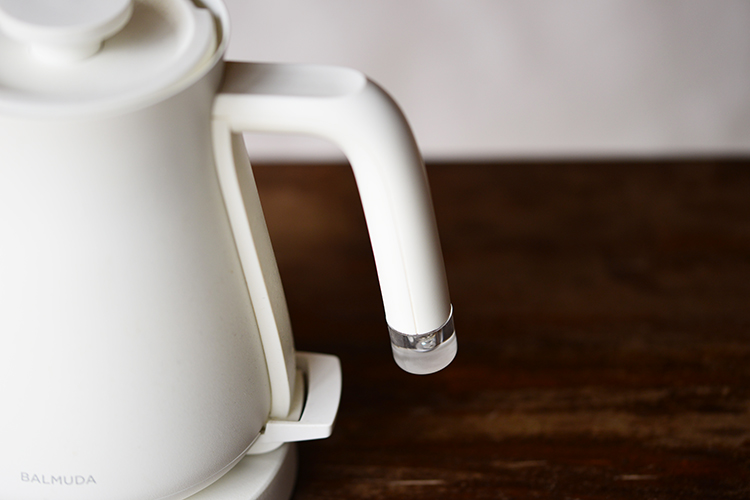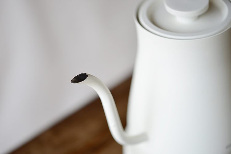 「小さくて美しい電気ケトル」。まさに、そのキャッチコピー通り。容量が0.6Lと少ないため本体が重くなりすぎず、ドリップ時のケトルコントロールが容易。斜めにカットされた注湯口は湯切れがよく、注ぎやすい。