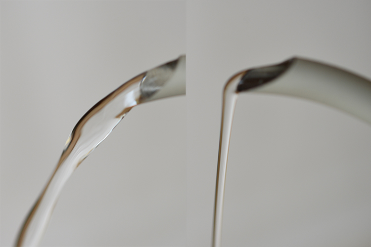 ▲斜めにカットされた注湯口と、緩やかな曲線のノズル