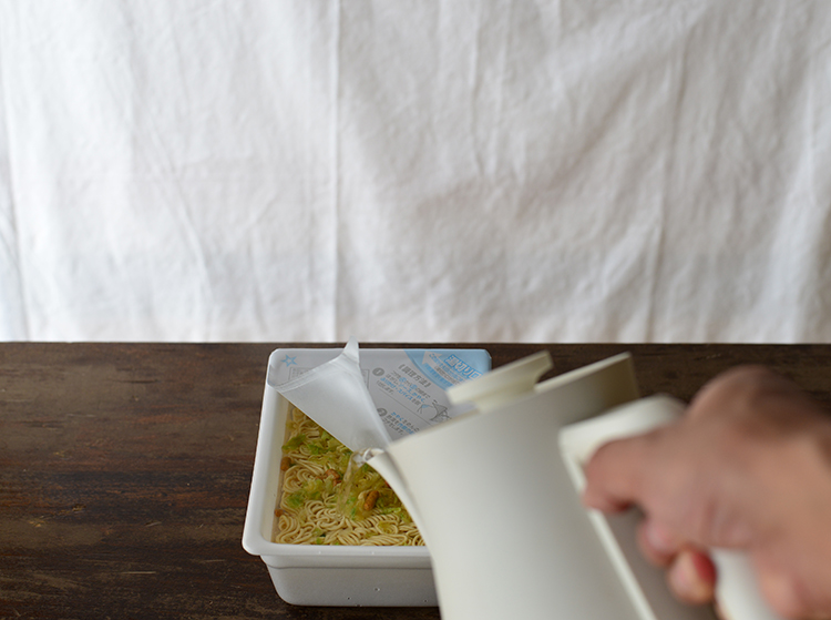 ▲カップヌードルはもちろん、その他のカップラーメンやカップ焼きそばまで注ぎやすい。バルミューダで入れると味は変わらないがオシャレ感が漂う