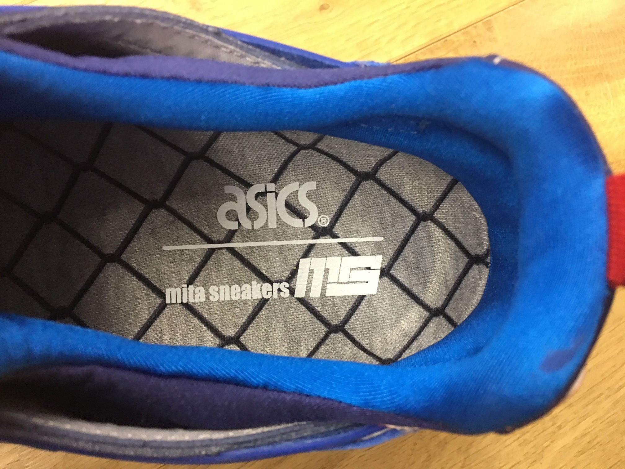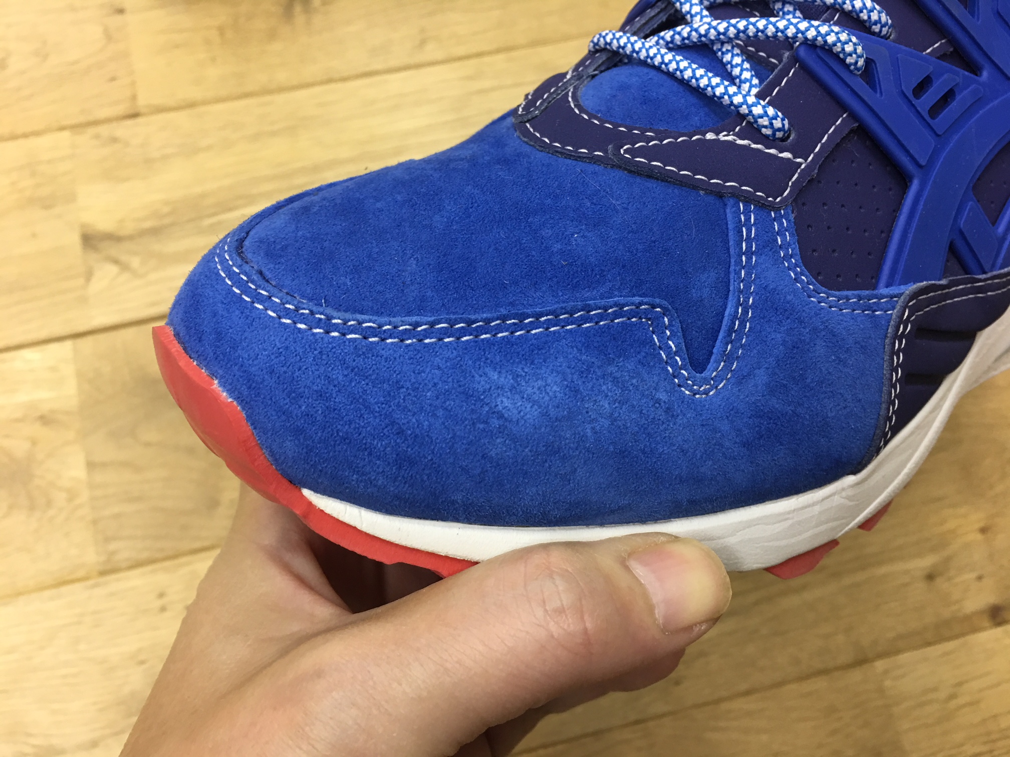 アッパーは上質なスエードをメインに構成されています。ブルーをメインにソールやヒールなどにレッド&ホワイトを散りばめ、トリコロールカラーに。こちらはミタがかつて手掛けたアシックスタイガーとのコラボレーションによるヒット作「GEL-LYTE III(ゲルライト3)」で採用したカラーリングへのオマージュとなります。