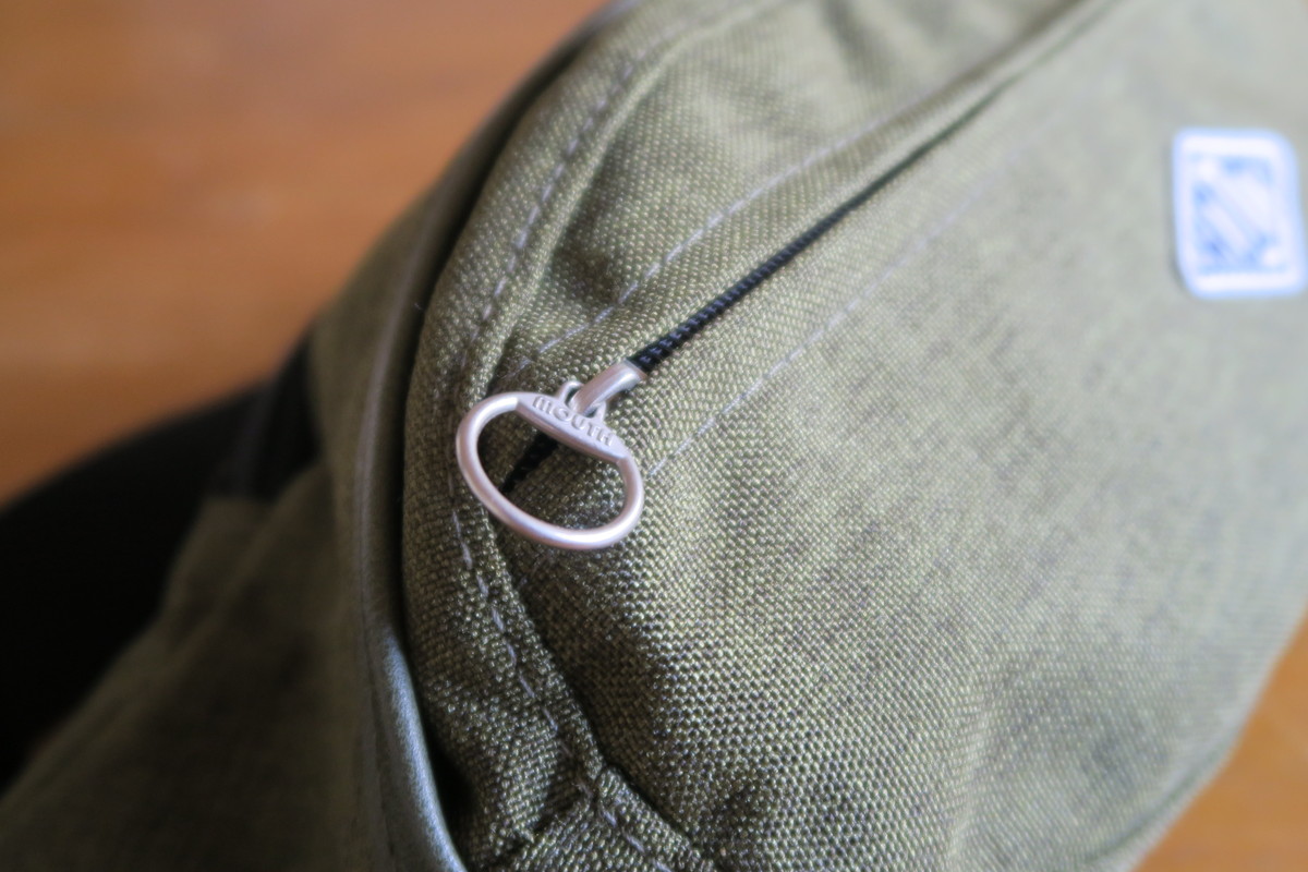また表側のファスナーには金属製の引き手が付いています。ここもファスナーが見えなくなるような被せが付いているので、引っ張りやすくなっているのはうれしい。デザインのアクセントにもなっています。
