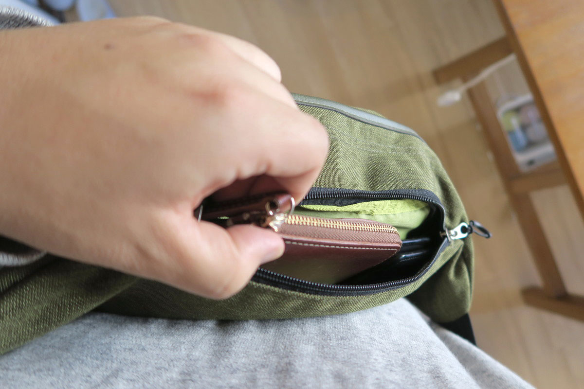そこで、この体側のファスナーが生きてきます。ここに財布やスマホを入れておけば、カメラのストラップに悩まされることなく、すぐに取り出せるんです。