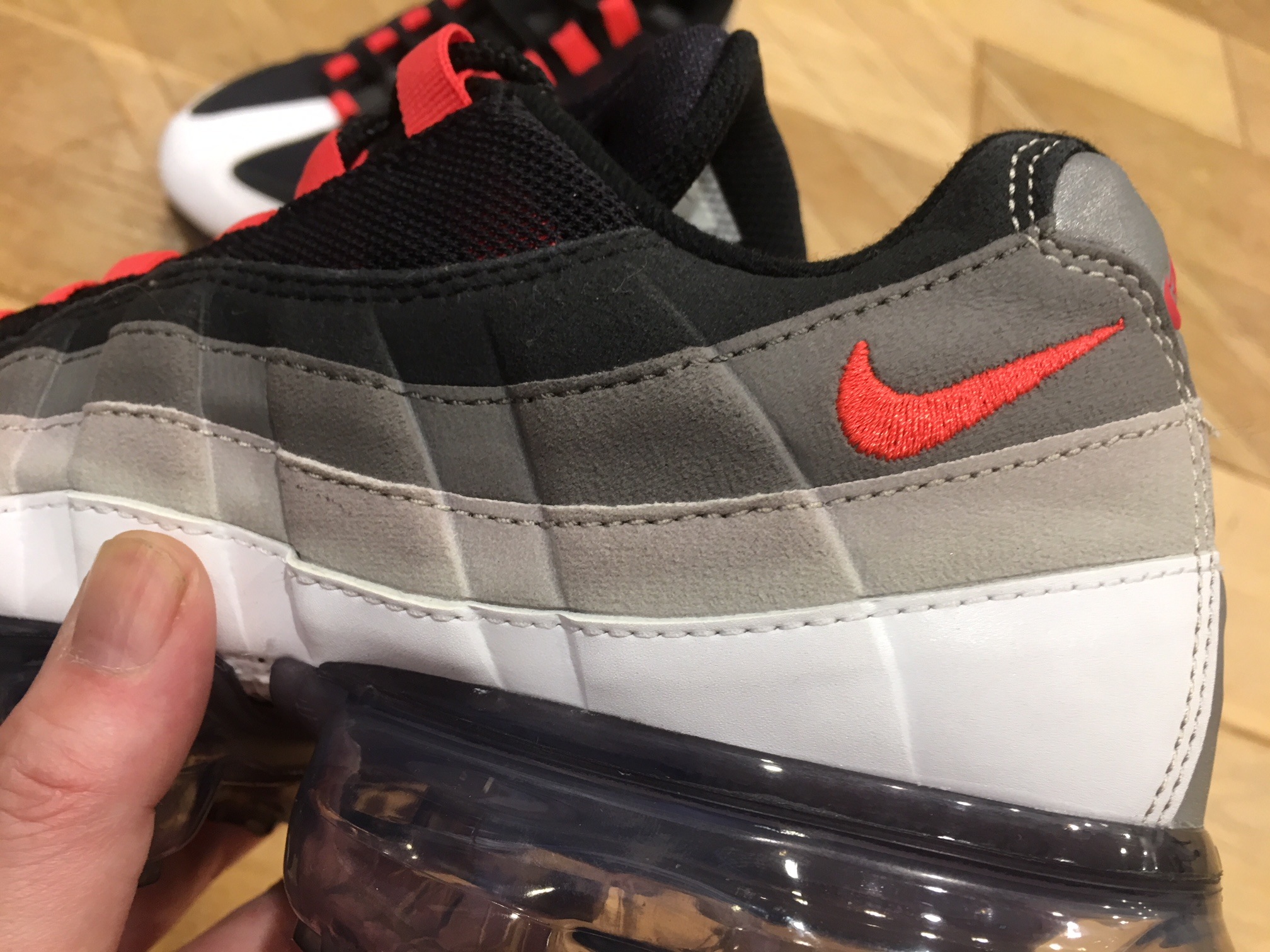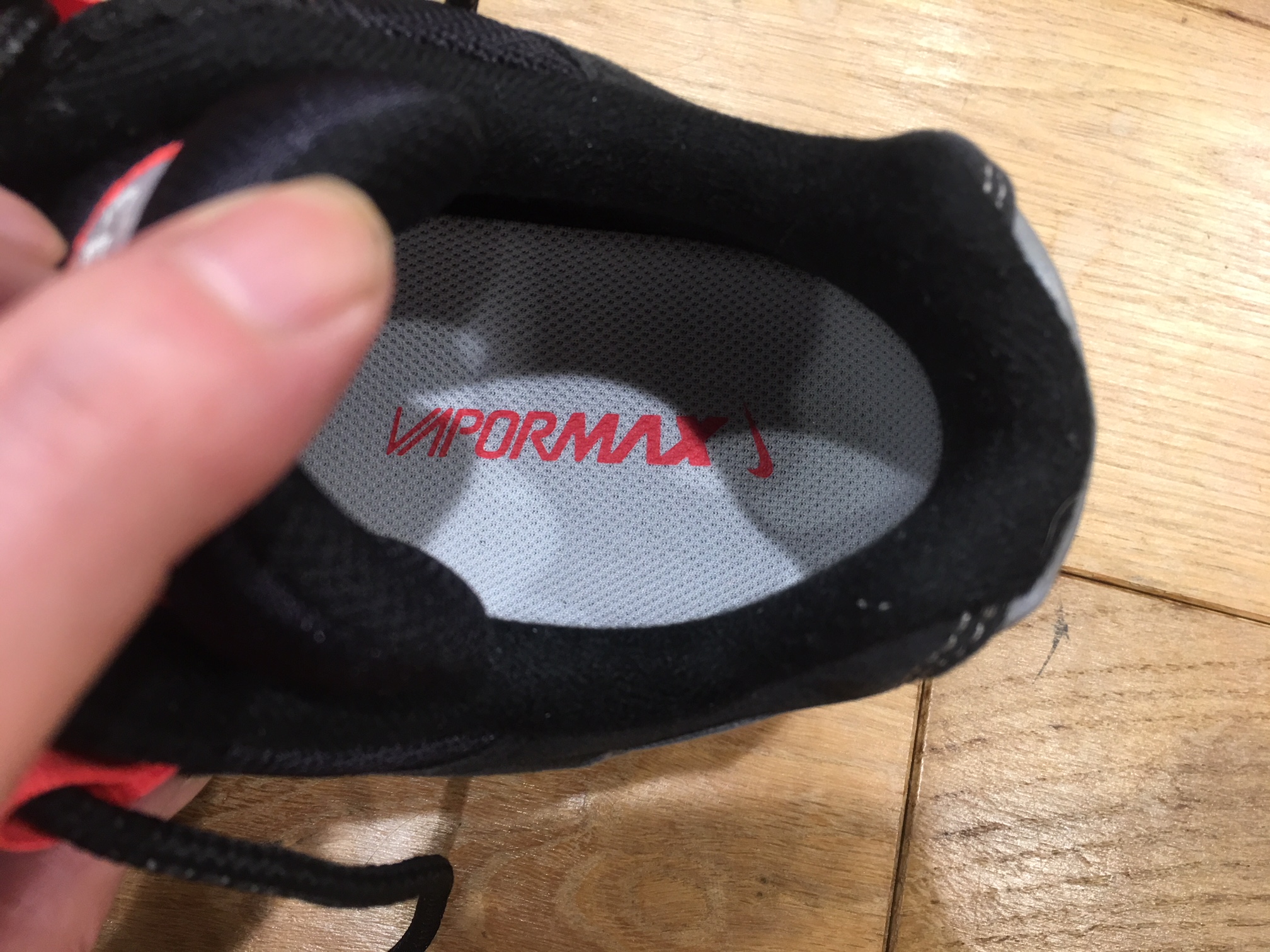 インソールには「ヴェイパーマックス」のロゴが入っています。まさかエラー品!? んなわけありません、ハイブリッドです。「エアマックス 95」なのに「ヴェイパーマックスとは…、ワタクシ本間的には何か不思議な感覚です。