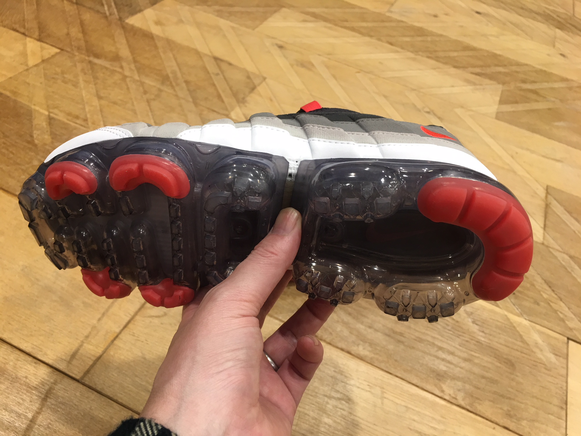 出ました、ソールはヴェイパー! ミッドソールとアウトソールが一体になった超軽量設計で、フカフカの履き心地です。まだ味わったことがない方は、是非とも一度お試しを!