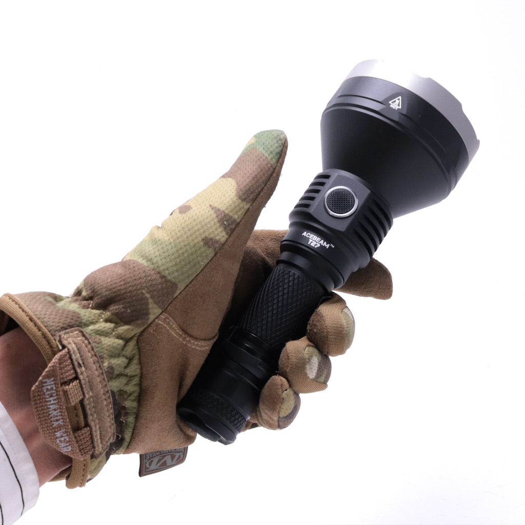 「T27」はデカヘッドが特徴的な、しかしハンディサイズのフラッシュライトです。さすがにこれを腰に下げて一日中ウロウロしろと言われるとちょっと面倒臭いですが、気合いを入れて短時間の任務をするなら問題なし、というサイズ感でしょうか。
