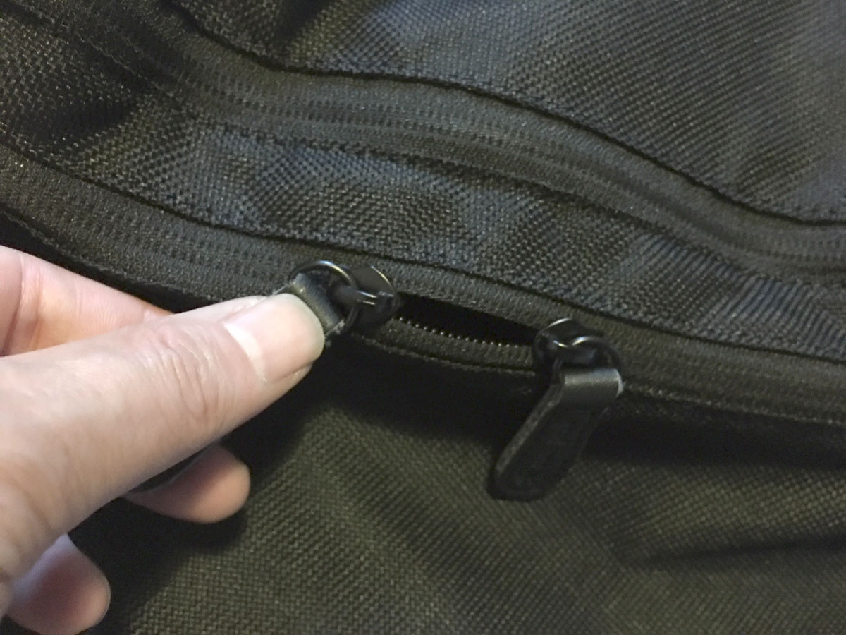 メインコンパートメントなどはダブルファスナーで、レールにファブリックのコーティングが施されているので、小さなゴミや細かいホコリなどが詰まるのを防いでくれます。