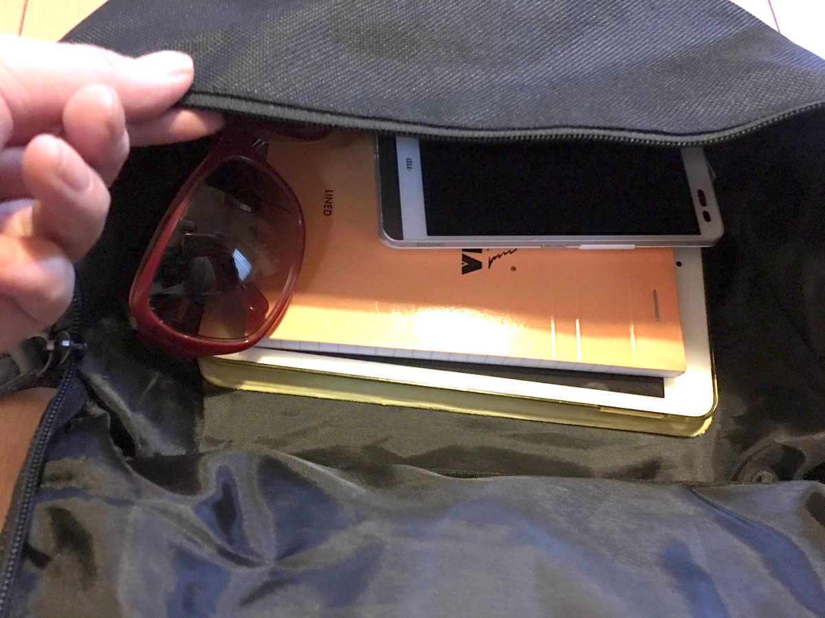 ウエストバッグのメインコンパートメントは幅300mm×奥行き150mmで、iPadミニやスマホ、手帖、サングラスといった小物はひと通り余裕で収納できちゃいます。