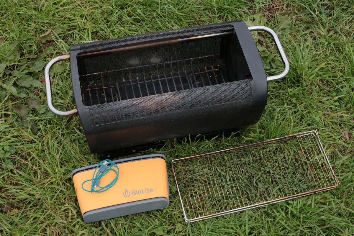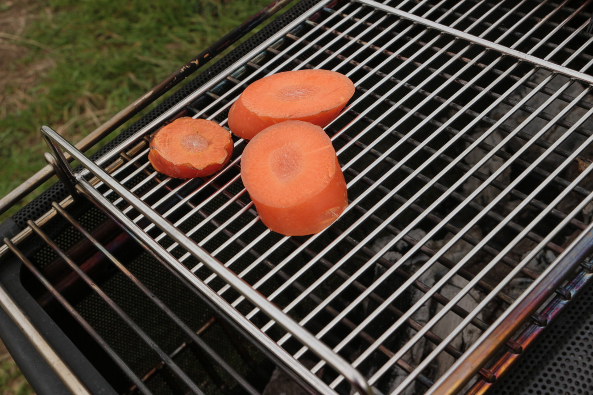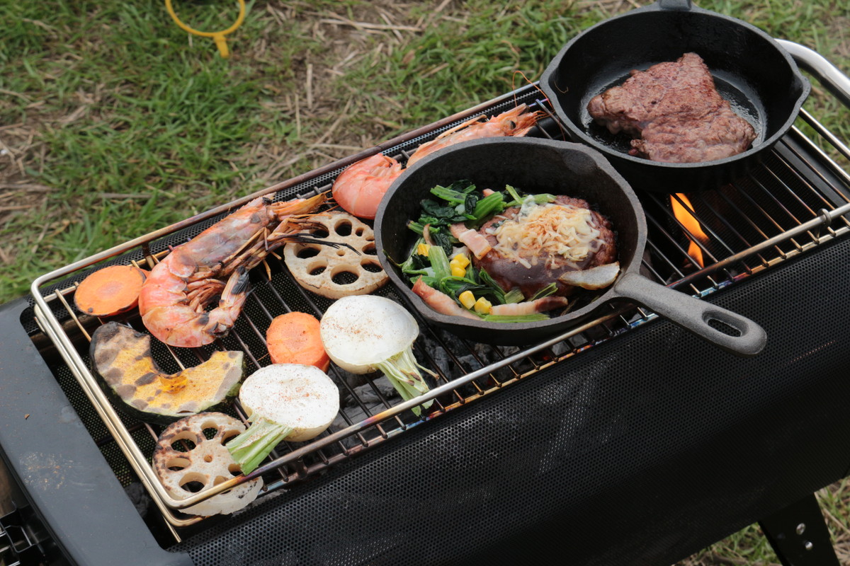 手元で風量を変えて火力を調整できるのは、結構便利です。ただし焼き網が広く、また本体側面がメッシュで熱がこもりにくいので、炭の量を変えて保温ゾーンを作ると食材がぬるくなってしまうことも。このあたりの調整は経験を重ねるしかありません。