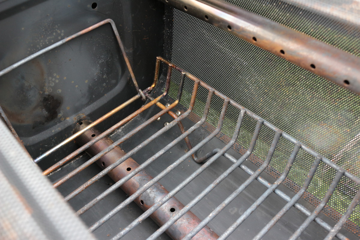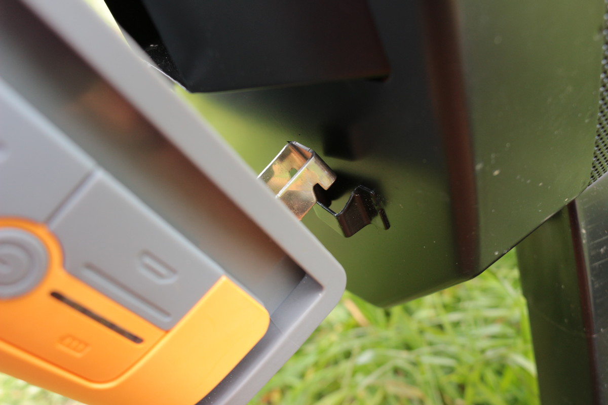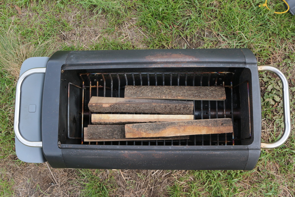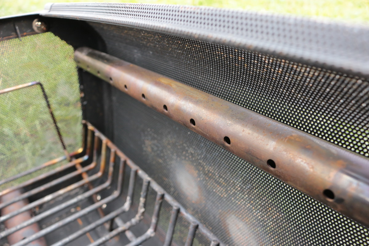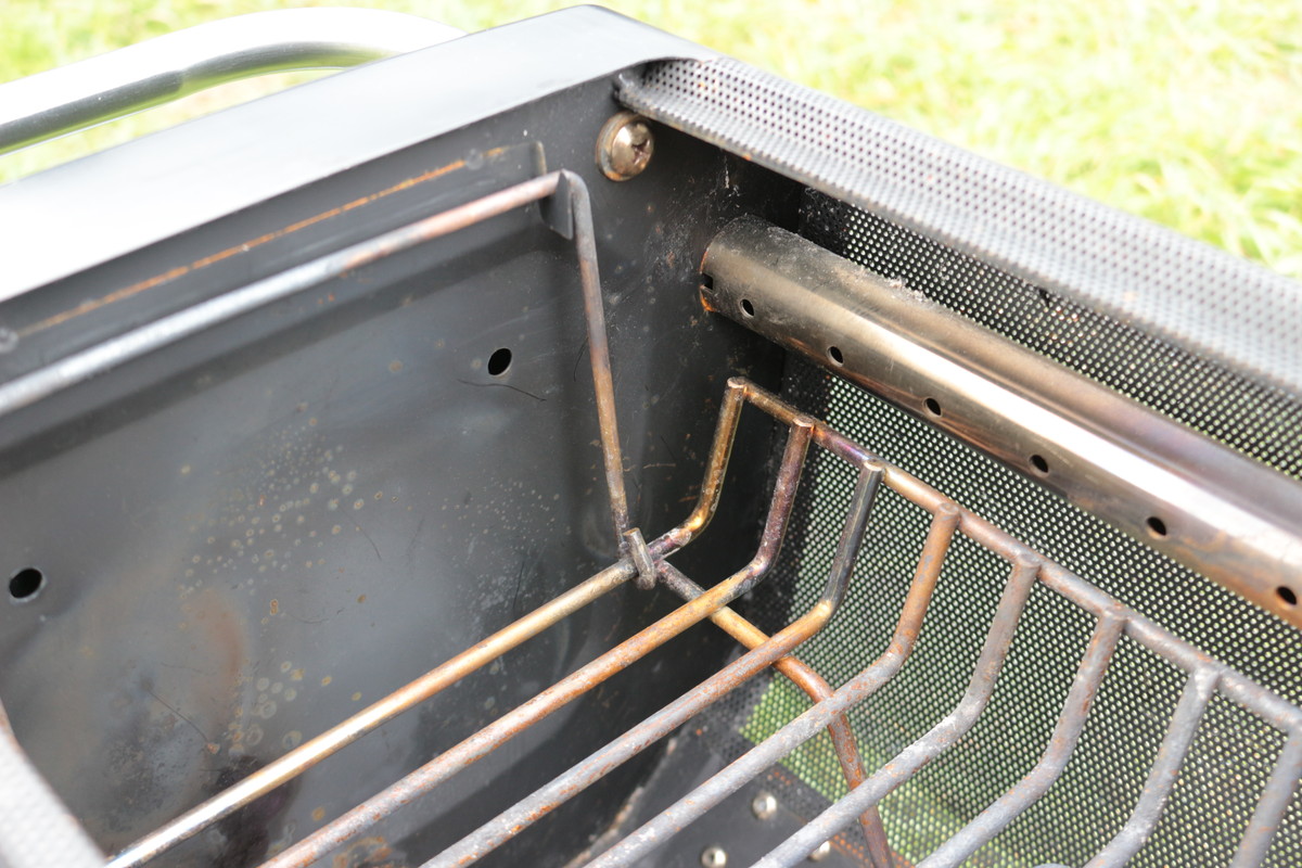 バッテリーパック内のファンが生んだ空気は、両脇と底に伸びる3本のパイプを伝って燃焼室内に送られます。パイプには全部で51個の穴が開いてます。底のパイプの上に燃料ラックが乗っているので、雑に薪を載せても空気が遮断されることはありませんし、うちわや火ふき棒がなくても大丈夫。炭の場合は、上部のパイプからの空気が威力を発揮します。